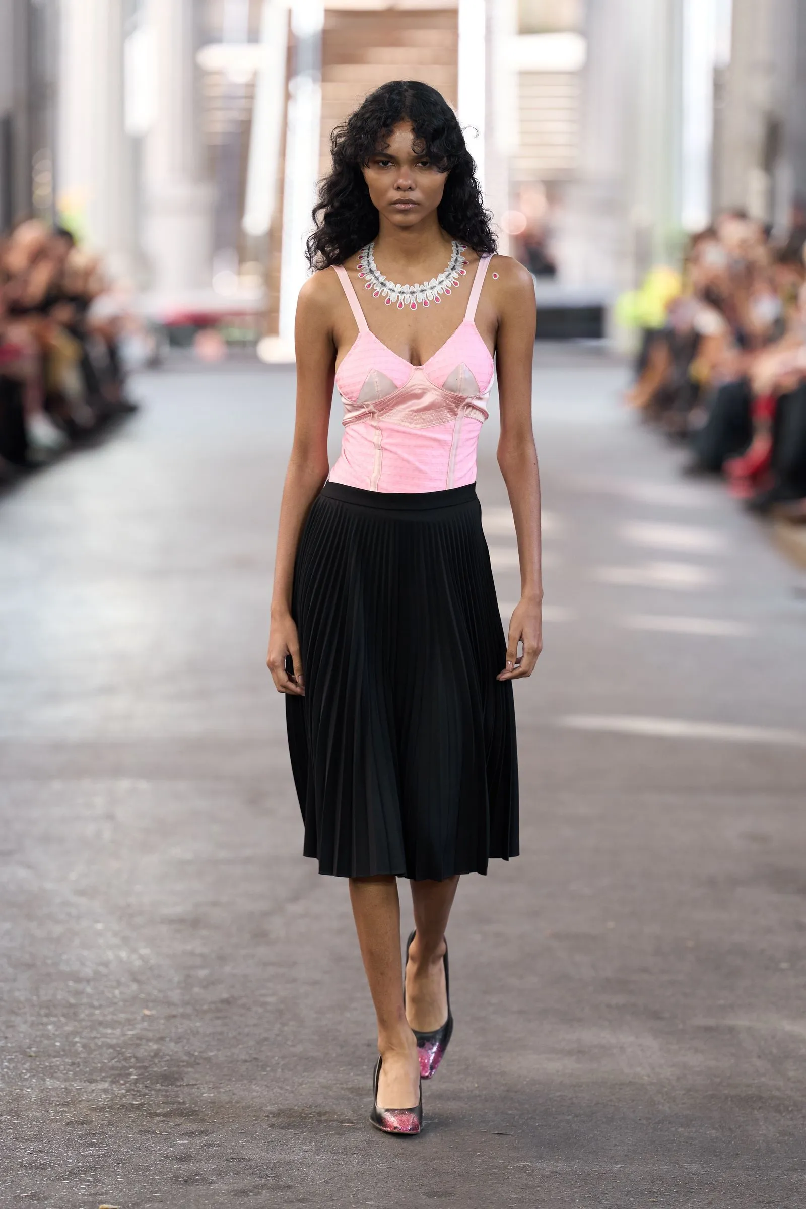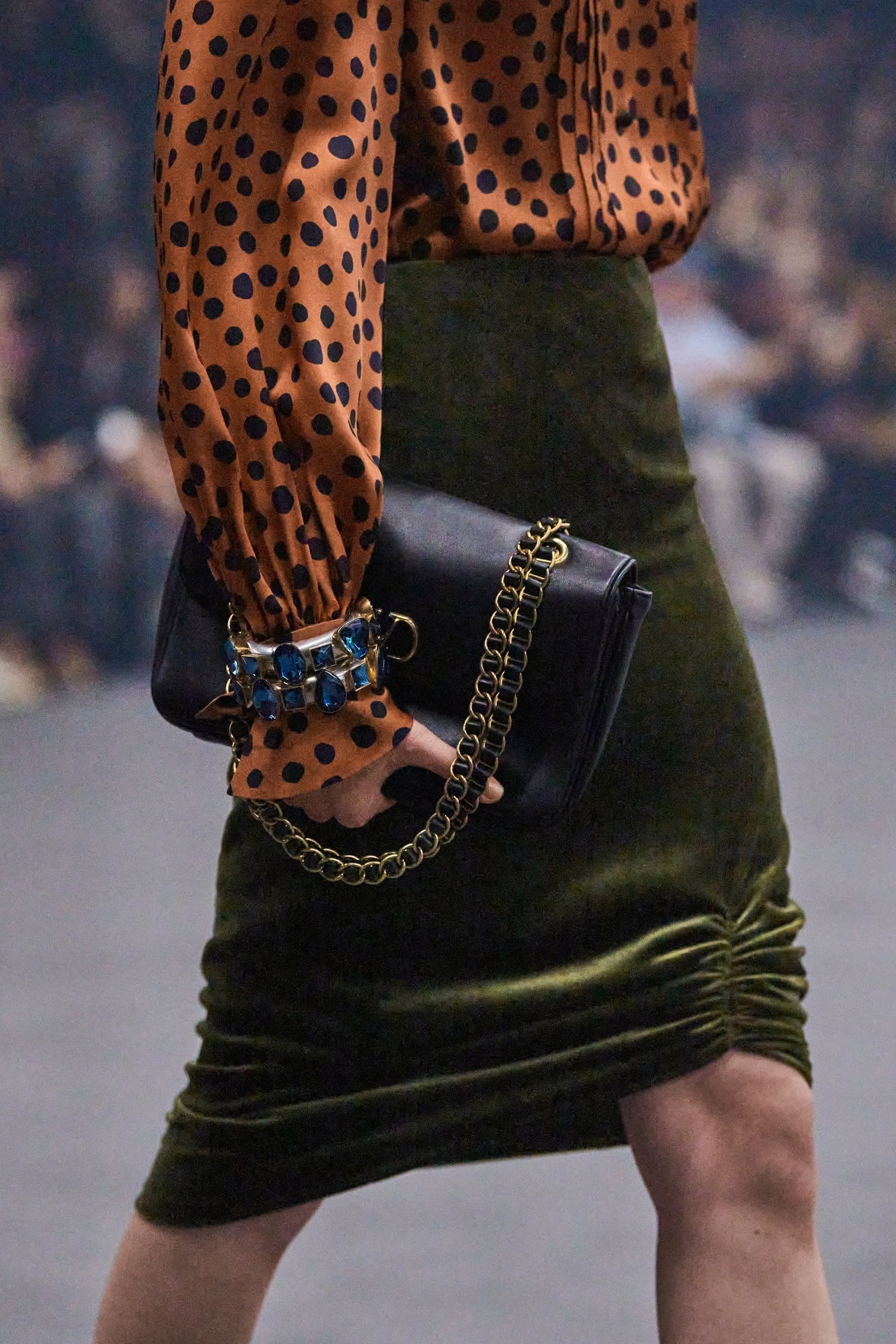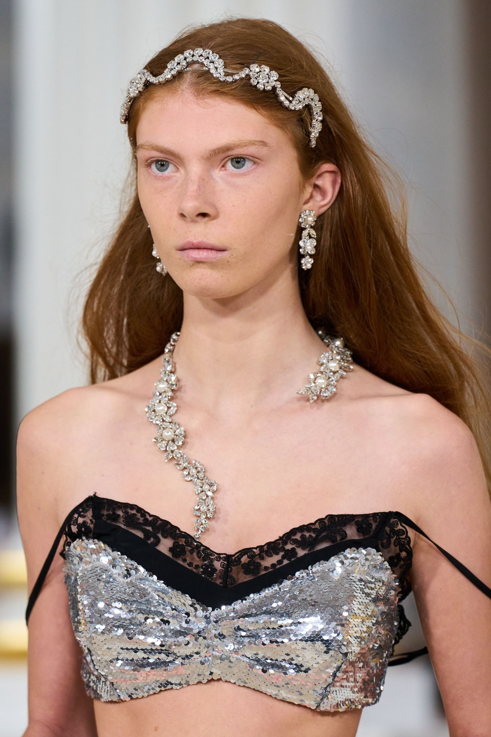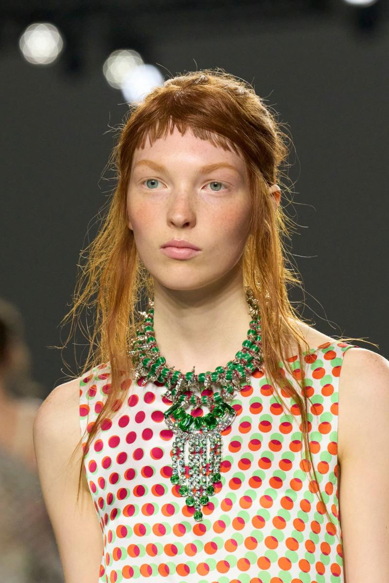 Modne hiše so razkošje kraljevskih dvorov interpretirale vsaka na svoj način. Saint Laurent je z velikimi poldragimi kamni na uhanih in ogrlicah dopolnil dekadentne silhuete oblek. Valentino je rokave retro bluz popestril z vpadljivimi zapestnicami, Collina Strada je svojo “kraljevsko ogrlico” obesila okoli pasu, Simone Rocha pa je bleščavost svojih videzov dodatno poudarila z naglavnimi obroči, uhani in ogrlicami, ki jih je stilsko uskladila. Čeprav estetsko različni, so imeli vsi en skupni imenovalec – pobeg od minimalizma in čistih linij k okrašenosti, vpadljivosti, bleščavosti in razkošju.