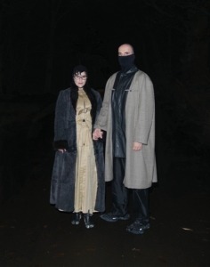 Paula nosi obleko Junya Watanabe Comme des Garçons, vintage plašč, kapo Madomorpho in čevlje Maison Margiela Tabi. Marko nosi pulover z masko CP Company, plašč Comme des Garçons Homme Plus, svilene hlače Vaida Voraitė in čevlje Balenciaga reptile.