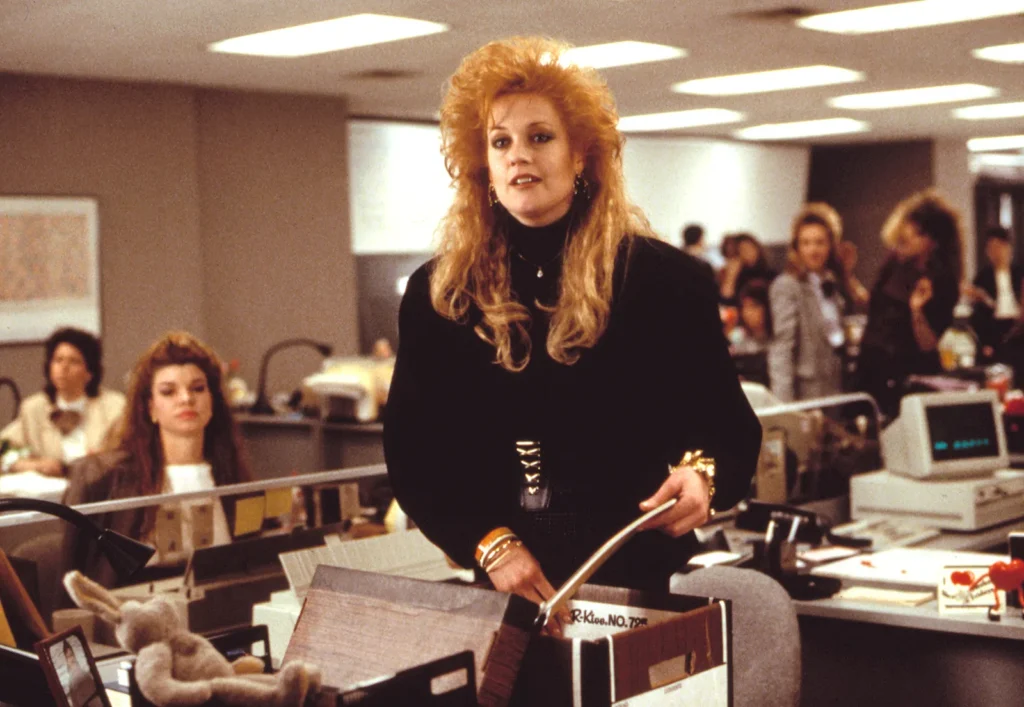 Ko govorimo o outfitih iz filmov, ki jih prenesemo v svojo poslovno omaro, ne smemo pozabiti na romantično komedijo Working Girl, v kateri Melanie Griffith igra Tess McGill, dekle, ki je absolutni modni navdih. Njeni outfiti sledijo trendom 80. let, kot so preveliki blazerji in poudarjena ramena, vendar je Tess vsaki obleki dala osebno, funky noto, zaradi česar so kosi neskončno zabavni. Čeprav so preprosti, se njeni outfiti odlično ujemajo s kul modnimi dodatki, zato kopiram nen način kombiniranja kosov za pisarno.