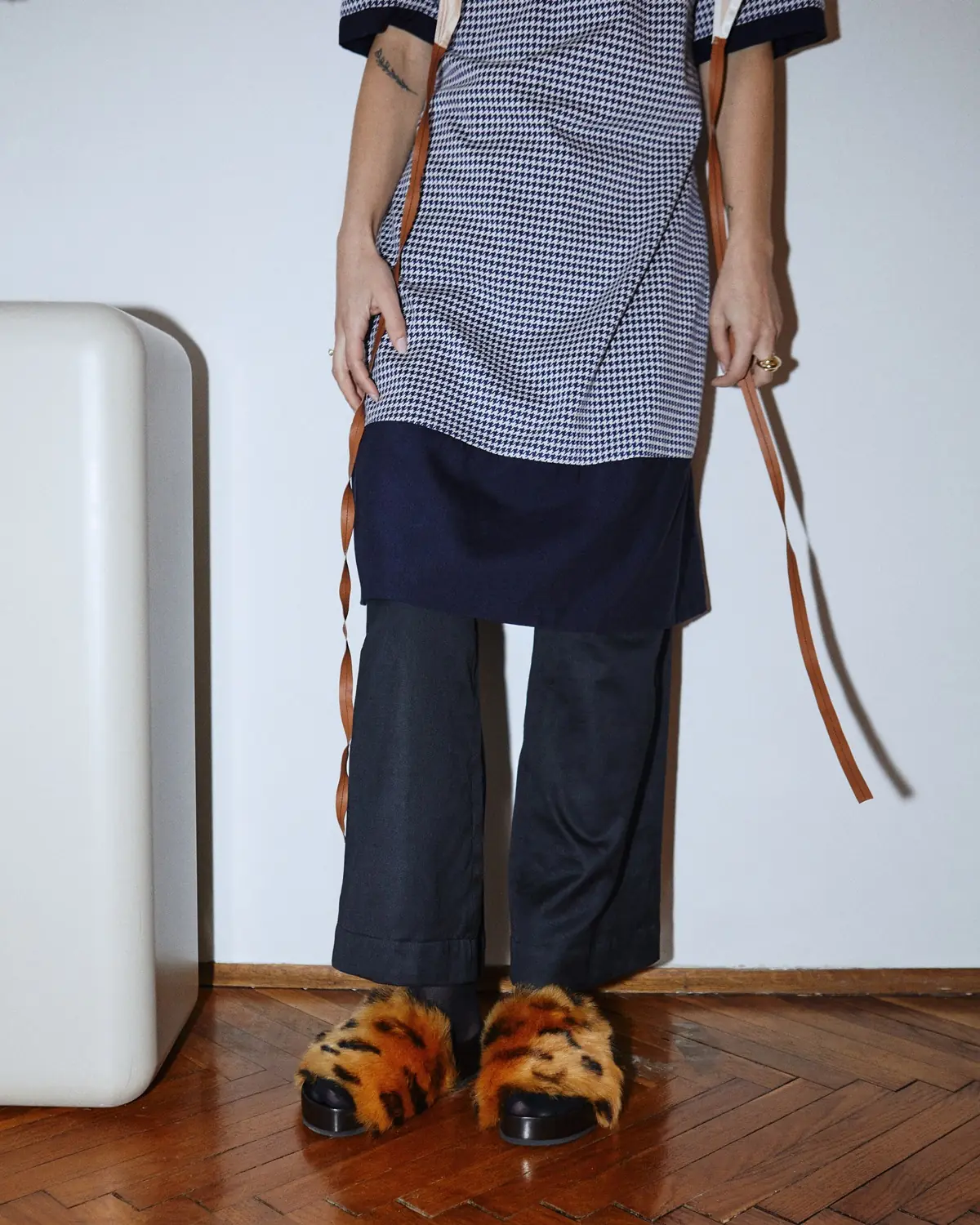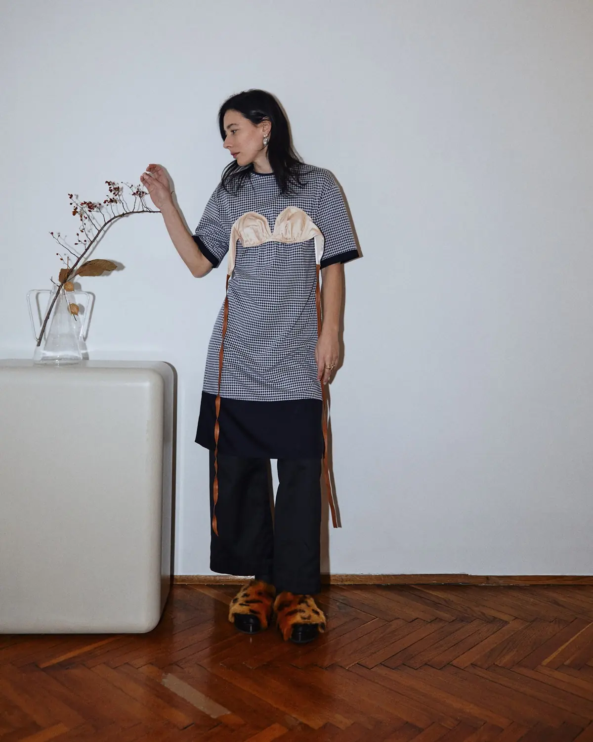 Radovedna kot deklica, ki komaj čaka, da dobi v roke novo Barbie svoje prijateljice, nekega popoldneva vstopim v Marijin showroom , da bi videla, kakšne čudeže z resale platform je dodala svoji kolekciji, odkar sva se zadnjič videli. Takoj na vratih me poleg šopkov suhega cvetja, ki jih Marija aranžira tako, da v vse, česar se dotakne, vnese svoj brezhiben stil, pričaka stojalo, na katerem visijo lično razporejeni predmeti, okoli katerih pa kampirajo pari najrazličnejših čevljev. Ena prvih stvari, ki jih opazim, so krzneni Céline natikači, ki jih komentiram kot pravo presenečenje v Marijinem arzenalu, a on ima že izdelano strategijo, kako jih bo nosila. Loewe obleka s pepita vzorcem in všitim nedrčkom v kombinaciji s preprostimi temnimi hlačami je le ena od rešitev. A poleg omenjenega so tu še Jil Sander usnjena torbica v minimalističnem slogu v svetlo rjavem odtenku, Balenciaga sandali z vpadljivimi belimi vezalkami, par Maison Margiela MM6 gležnarjev z ovalno belo peto ter oprijet Maison Margiela x H&M top s potiskom “nedrčka”, po čemer sklepamo, da ima Marija s tem motivom posebno vez. To je le nekaj kosov, ki jih je oblikovalka pridobila v zadnjem času, nekateri pa še čakajo na svojo priložnost, da prvič zasijejo v Marijinem stajlingu.