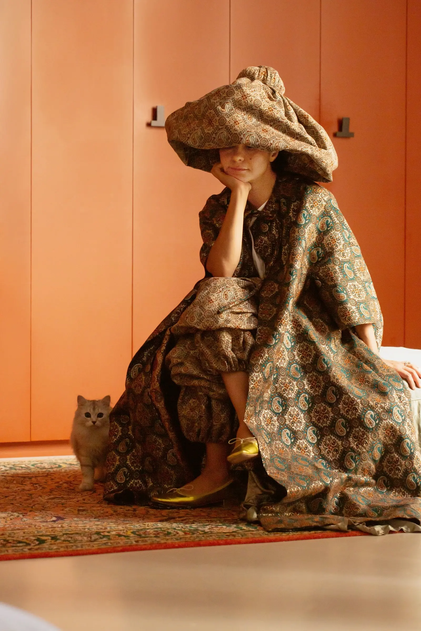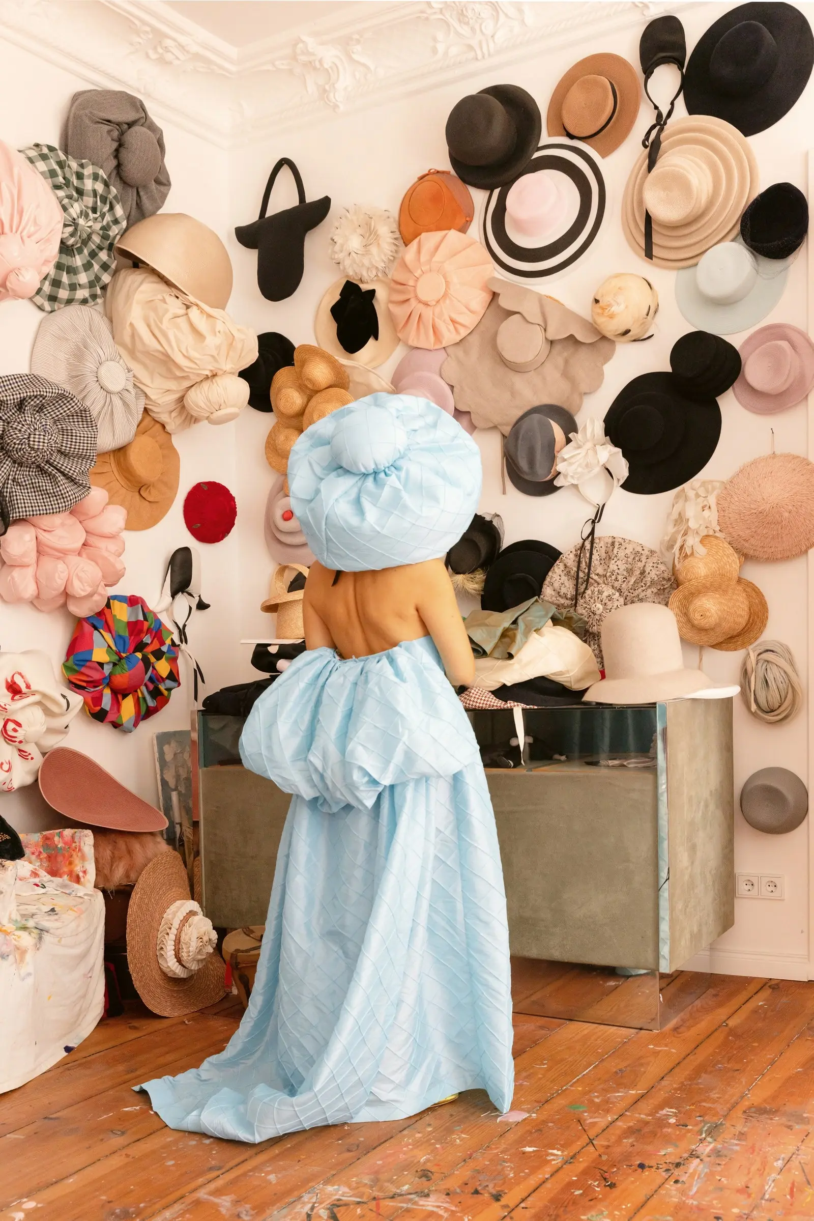 Po umetniški šoli je Maryam Keyhani najprej delala kot oblikovalka nakita – tudi v Parizu in Buenos Airesu –, “toda ta svet mode ni za moj živčni sistem”. Vrnila se je v svoj svet kiparstva in umetnosti ter oblikovala svoje danes prepoznavne klobuke. Kako ji je to uspelo? “To je nekaj na osebni ravni,” pojasnjuje. “So ljudje, ki nosijo klobuke in tisti, ki jih ne.” Maryam je kot mlado dekle vedno nosila klobuke in se v zgodnjih dvajsetih zaljubila v vintage modele v Parizu. Večina klobukov, ki so ji bili všeč, je bila običajno predraga za njen proračun. Zato je začela oblikovati svoje lastne. Ko so jo vse pogosteje spraševali o njenih nenavadnih dizajnih, je začela izdelovati klobuke za stranke. In nenadoma je to postalo služba: “Ustvarjanje umetnosti in izdelovanje klobukov.” Njeno ekscentrično vesolje – nadrealistično, minimalistično, teatralno hkrati – spominja na kreacije modne oblikovalke Else Schiaparelli iz tridesetih let prejšnjega stoletja, oblike njenih skulptur na kiparja Constantina Brâncușija, njena oblačila pa na neobaročno razkošje. Obstajajo klobuki, ki so videti, kot da so zloženi drug na drugega in tvorijo stolpe, ali pa sedijo na njeni glavi kot gosti oblaki. Pasovi v obliki rok, ki se ovijejo okoli pasu kot roke prijatelja in naglavni trak za lase z Napoleonovimi kapami. Oblikuje tudi dramatične obleke iz svilenega moreja in črtaste kaftane z lesketajočim učinkom lureksa.