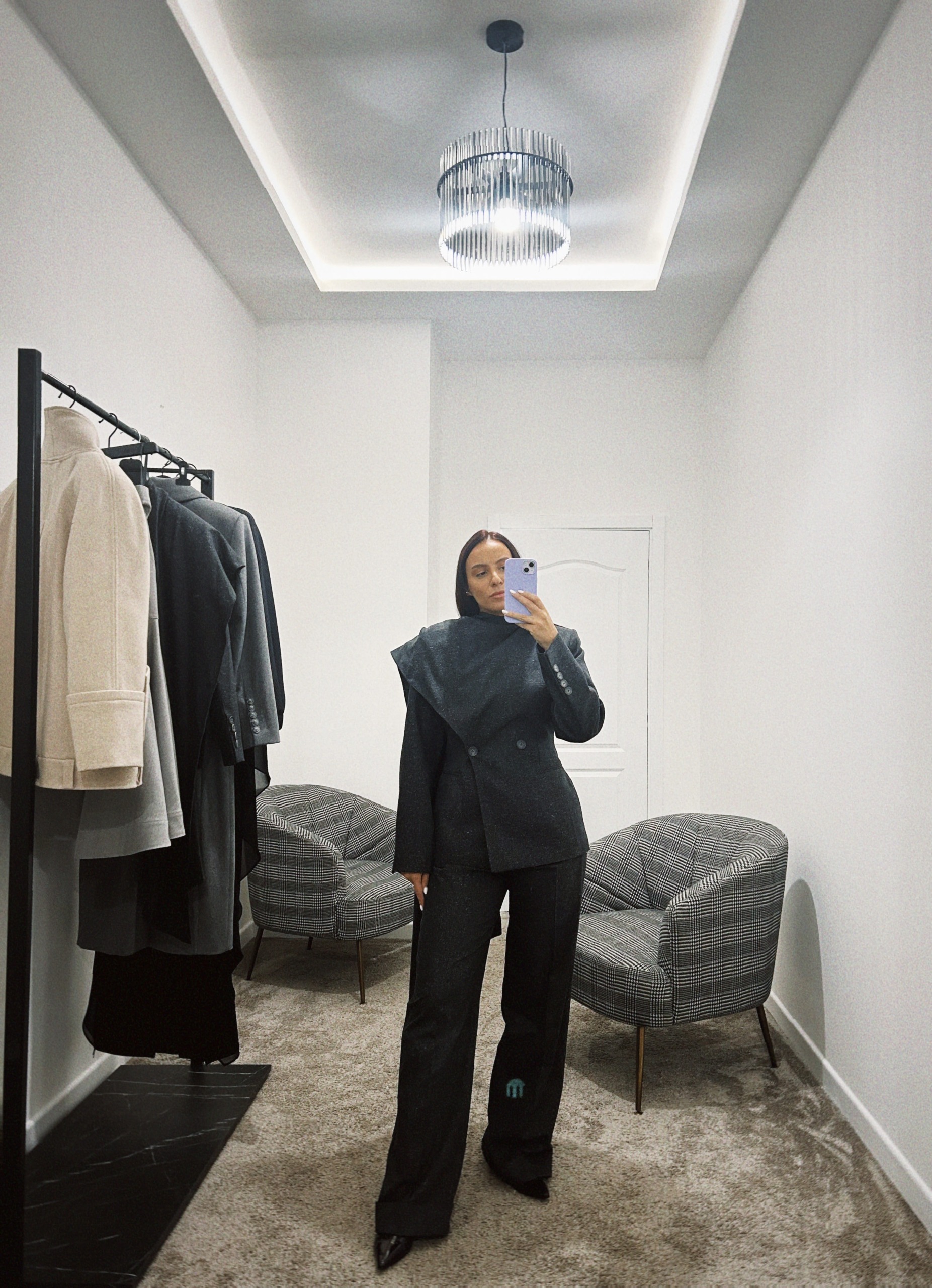 Dobro se spominjam poletja, ki so ga zaznamovali Mom’s Pants kombinezoni – in to sezono prepoznavni kos dobi novo različico, s črtami in še bolj presenetljivo silhueto. In takrat, skoraj postopoma, tej drznosti sledi nov šal kostim, ki predstavlja harmonično kombinacijo sodobnega, asimetričnega dizajna in klasične elegance. Če se vam zdi znano, ste morda nekoč našli nekaj podobnega v mamini omari. Izhodišče v mojem primeru je vedno enako – mamina omara, ki je zame neizčrpen vir navdiha. Odraščala sem ob tem, ko sem jo opazovala, s kakšno lahkotnostjo in stilom kombinira različne kose, retro kroji, ki sem jih absorbirala iz njene garderobe, pa so oblikovali mojo ljubezen do mode. Kombinacija nostalgije in sodobnih detajlov nam je omogočila ustvarjanje kosov, ki so prepoznavni, a tudi prilagojeni današnjim trendom. Od kombinezonov in kostimov, ki popolno poudarijo postavo, do volnenih plaščev, ki zagotavljajo toplino in eleganco, je vsaka podrobnost skrbno premišljena. Ta kolekcija je več kot od oblačil; Je poklon vsem ženskam, ki so me navdihnile, še posebej mami, hkrati pa služi kot spodbuda vsem, da raziskujejo svoj edinstven stil in se izrazijo skozi modo, pravi Jelena, pri čemer ugotavlja, da ima ta kostim več možnosti za stiliziranje šalov – tako da odraža vašo individualnost.