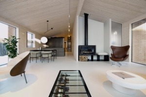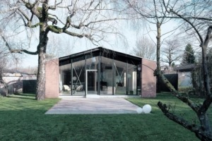 Ker je zahodna stran hiše obrnjena proti parku, je lahko bila razširitev bolj odprta in svobodneje oblikovana, a še vedno zasidrana v duh Murgel. Novi volumen so zasnovali kot lahek paviljon iz lesa in stekla, pod podaljšano streho, ki mehko povezuje staro in novo. Dva opečnata stebra, enaka tistima z izvorne fasade, delujeta kot diskreten poklon tradiciji naselja. Leseni bočni steni nudita zaščito in zasebnost, medtem ko se steklena fronta popolnoma odpira proti vrtu. Ohranili so tudi veliko brezo, enega ključnih prepoznavnih elementov kraja, in celo prilagodili temelj, da bi zaščitili njeno korenino, s čimer so nadaljevali Murgelsko filozofijo gradnje v dialogu z drevesi.