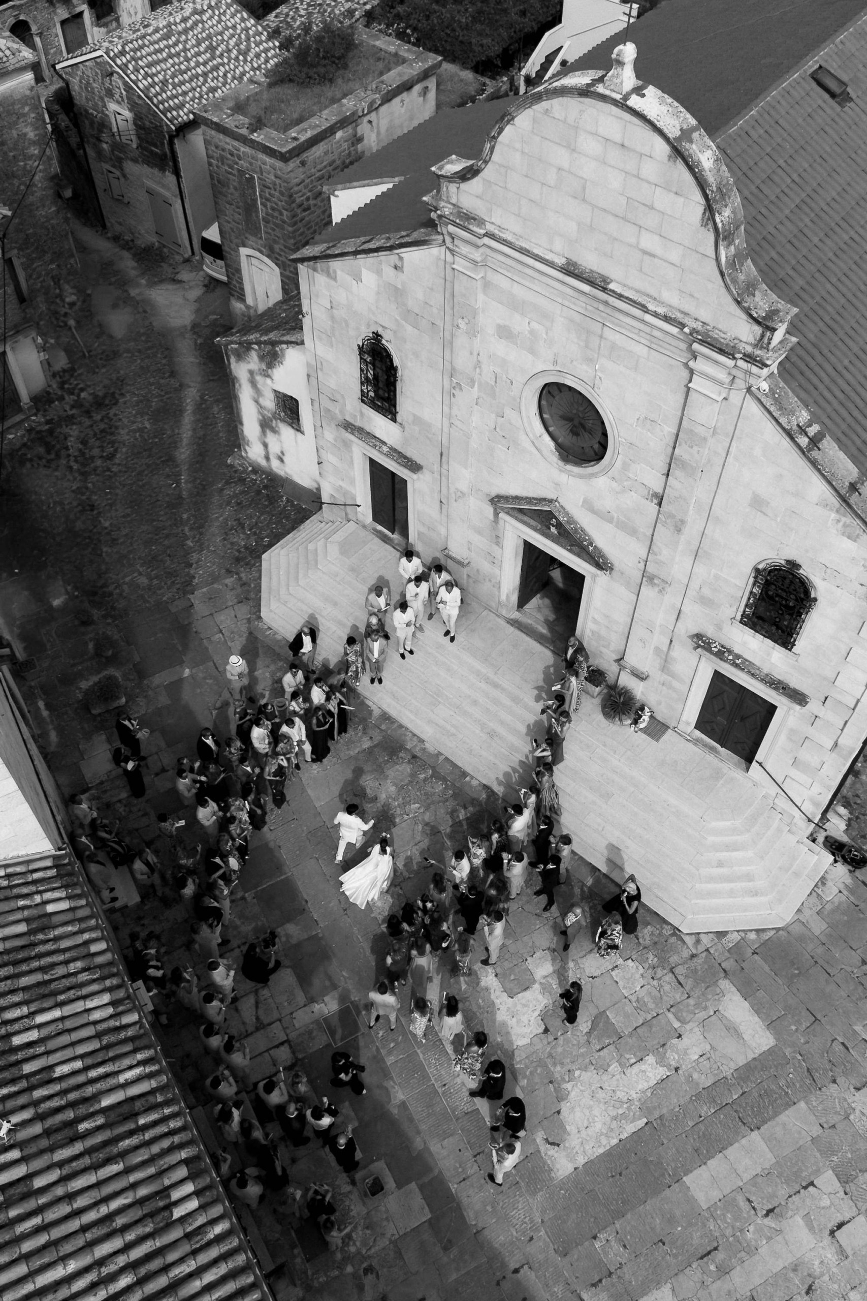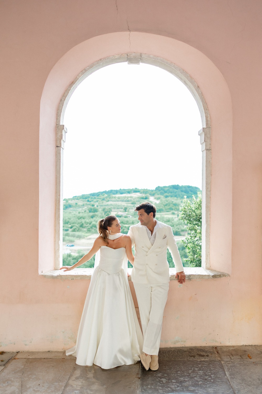 “Gosti so prejeli personalizirane pizza škatle in koktajl kozarce z inicialkami, ročno izdelane rute v barvah poroke pa so jih spomnile na dogodek, ki šele prihaja,” pojasnjuje Antun in nadaljuje z opisom lokacije ceremonije, ki je potekala v župnijski cerkvi sv. Jurija, postavljeni na trgu v starem delu Oprtlja. “Ta zgodovinska cerkev iz 16. stoletja izžareva avtentično lepoto, impresivne stopnice, ki vodijo do vhoda, pa dodatno poudarjajo njen veličasten videz. Prav ta prostor je ustvaril popolno kuliso za njun najbolj intimen in najpomembnejši trenutek ter ga napolnil s tišino, dostojanstvom in brezčasno eleganco.”