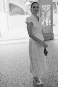 Poročni obred:Poročna obleka: Kyha StudiosObleka po zabavi: Sherri HillŠopek Muse MontmartreUhani: Jennifer BehrČevlji: Stuart Weitzman