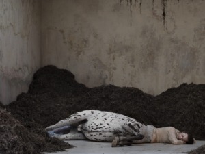 Na samem koncu tega zelo intenzivnega, temačnega in čustvenega potovanja pridemo do prostora, ki sem ga zasnovala v krožni osnovi; stene so razpokane, narava pa je tukaj – bolj kot kjerkoli prej – prevzela oblast. Veje, mah in razno rastlinje prodirajo skozi starodavne zidove in neizbežno razkrivajo svojo moč. Celoten prostor zapolnjuje le ena stvar – imerzivna prostorska instalacija We Walked the Earth danskega umetnika Uffea Isolotta, ki je zastopal Dansko na Beneškem umetnostnem bienalu leta 2022. Tri kentavroidna telesa, napol človeška, napol živalska, ležijo v prostoru, ki je hkrati dom in grobnica. So tragična in spokojna hkrati, združena z okoljem, ki je prevzelo vse. V kontekstu te imaginarne razstave to delo deluje kot trenutek po ekstazi, po obredu, po očiščenju. Tako kot pesem in video združujeta religiozne motive in telesno energijo, sakralne in sodobne elemente v istem dihu, tudi Isolottova instalacija briše meje med svetim in profanim, življenjem in smrtjo, telesom in naravo. Zaključi krog – od Géricaultovega obupa, prek Hirstove in Goyine borbe, do mehaničnega vrtinca Sun Yuana in Peng Yu – in nas pripelje do točke, kjer človeško telo ni več središče, temveč le ostanek sveta, ki je prešel v drugo stanje.