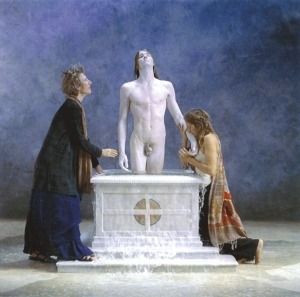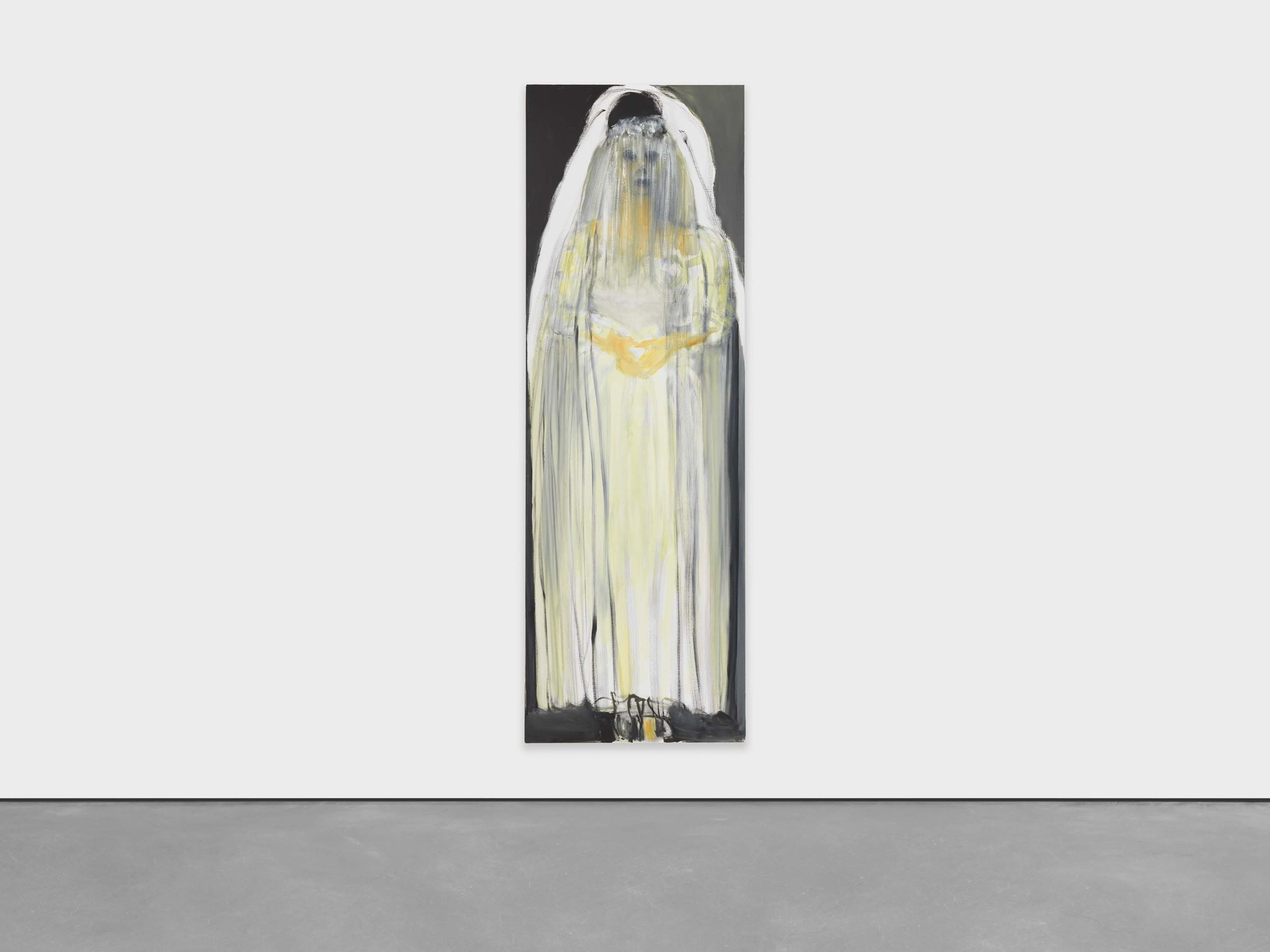 V naslednjem prostoru, pod baldahinom iz belega prosojnega materiala, ki visi s stropa, nas najprej pričaka bronasti kip Marije Magdalene umetnice Kiki Smith iz leta 1994. Stene so osvetljene s pridušeno rdečo svetlobo, na njih pa visita dve sliki – Bride in Teeth južnoafriške sodobne umetnice Marlene Dumas (obe iz leta 2018). V tem prostoru se vse kristalizira v figuri ženske – fatalne, grešne in ranljive hkrati. Marija Magdalena Kiki Smith, bronasta in težka, deluje kot telo, ki je šlo skozi odrešitev in na koži ohranilo sledi zemlje. Njena prisotnost je skoraj liturgična, toda svetloba je rdeča, zatemnjena, in namesto čistosti prikliče željo. Stene okoli nje nosijo obraze in usta ženske, ki ljubi, požira, čaka, vene. V tem trikotniku – Smith, Dumas, Rosalía – se rojeva sodobna različica Magdalene: ne več sveta niti demonizirana, temveč bitje, ki razume, da sta ljubezen in kazen, eros in krivda le dve plati istega telesa.