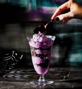 Za nocoj vam zato iz knjige izpostavljamo naslednjo kremasto sladico – Nightshade Society Poe Parfait. “Ne moremo kar tako spustiti kateregakoli nerodnega obiskovalca skozi naša vrata, ki jih varuje Edgar Allan Poe. Na srečo vam ni treba reševati ugank ali poznati skrivnih klikov, da bi uživali v našem značilnem parfaitu, poimenovanem po našem slavnem bivšem študentu. Ta sladica, ki spominja na barve uniform akademije Nevermore, je sestavljena iz plasti ube kreme, drobljenca iz črnega kakava in sezama ter ube stepene smetane. Tako okusen je, da ga ne boste mogli dolgo skrivati pred družbo,” so nam povedali člani Nightshade Society društva. Kdo smo mi, da podvomimo, prižgimo štedilnike!