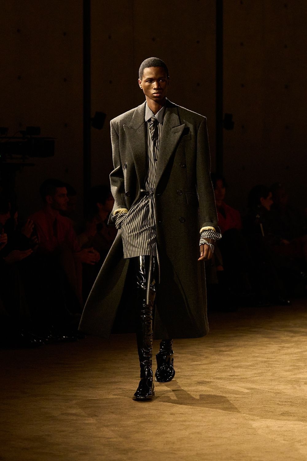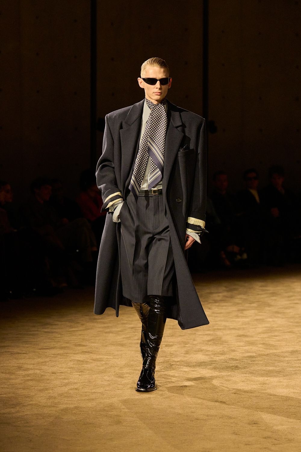 Za razliko od klišejske moškosti, ki izžareva moč skozi “kvadratne” silhuete oblek in ojačana ramena, so bile silhuete novih suknjičev nekoliko omehčane, da bi bile bolj sproščene, medtem ko je bil mood še vedno klasično Saint Laurentov. Brezhibno krojeni plašči in srajce s svilenimi šali, ki kukajo izpod ovratnikov, so kombinirani s kratkimi hlačami, ki spominjajo na spodnje perilo, in lateks škornji, ki segajo nad kolena. Kar sicer ostaja zasebno in skrito, kot spodnje perilo ali fetišiziran kos obutve, v uglajeno gosposkost vnaša nepričakovano protislovje in nas spodbuja k razmisleku o plasteh osebnosti ljudi okoli nas, ki jih pravzaprav sploh ne poznamo.