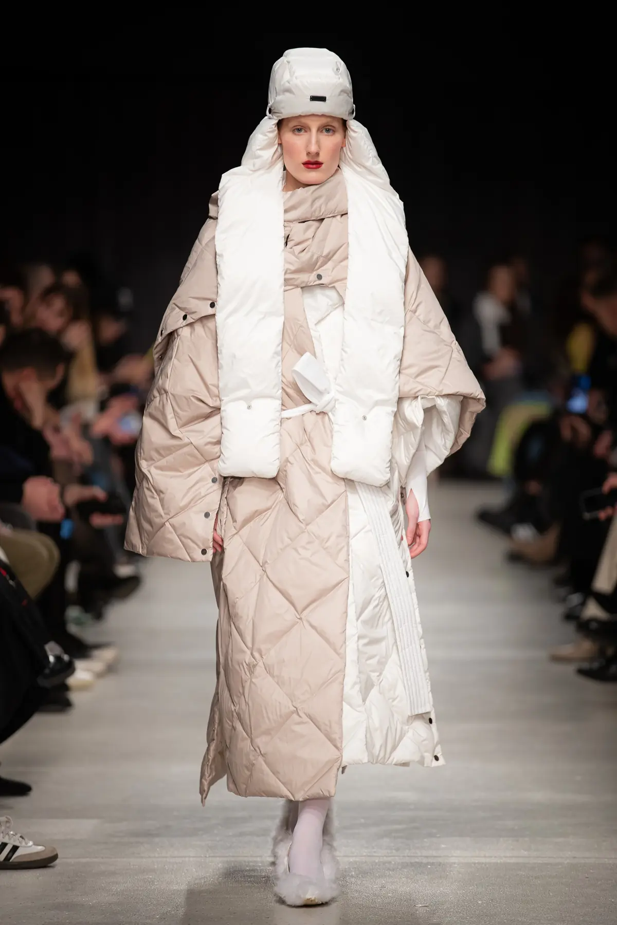 Športna oblačila, na primer za kolesarjenje, v nenavadnih barvnih kombinacijah so ena prvih stvari, na katere bodo pomislili poznavalci dela Flóre Poprádi in njene znamke Cukovy. Lansirana leta 2014 Cukovy črpa navdih iz vsakdanjega življenja in spreminja prepoznavne motive v nosljive umetnine. Poprádi je pri ustvarjanju kolekcije za sezono jesen/zima 2025/26 našel navdih v harmoniji narave in osebni transformaciji, zaznamuje pa jo modularna zasnova, ki je zaščitni znak znamke. Vsak kos je izdelan na Madžarskem v sodelovanju z lokalnimi obrtniki in dobavitelji, Cukovy pa uporablja izključno visokokakovostne materiale, uvožene iz Italije. Poudarek kolekcije je na puffer jaknah, plaščih, telovnikih in modnih dodatkih, kot so klobuki, ki jih lahko zaradi modularnih elementov spreminjamo in prilagajamo priložnosti in osebnemu slogu. Čeprav so puffer jakne sinonim za hladne zimske mesece (kot so ti v Budimpešti) in jih najpogosteje nosimo v kombinaciji s športnimi ali casual oblačili in obutvijo, nam je Cukovy dala odličen navdih za nekoliko drugačen stajling, saj je dolg puffer plašč kombinirala z vpadljivo belo kapo in krznenimi salonarji.