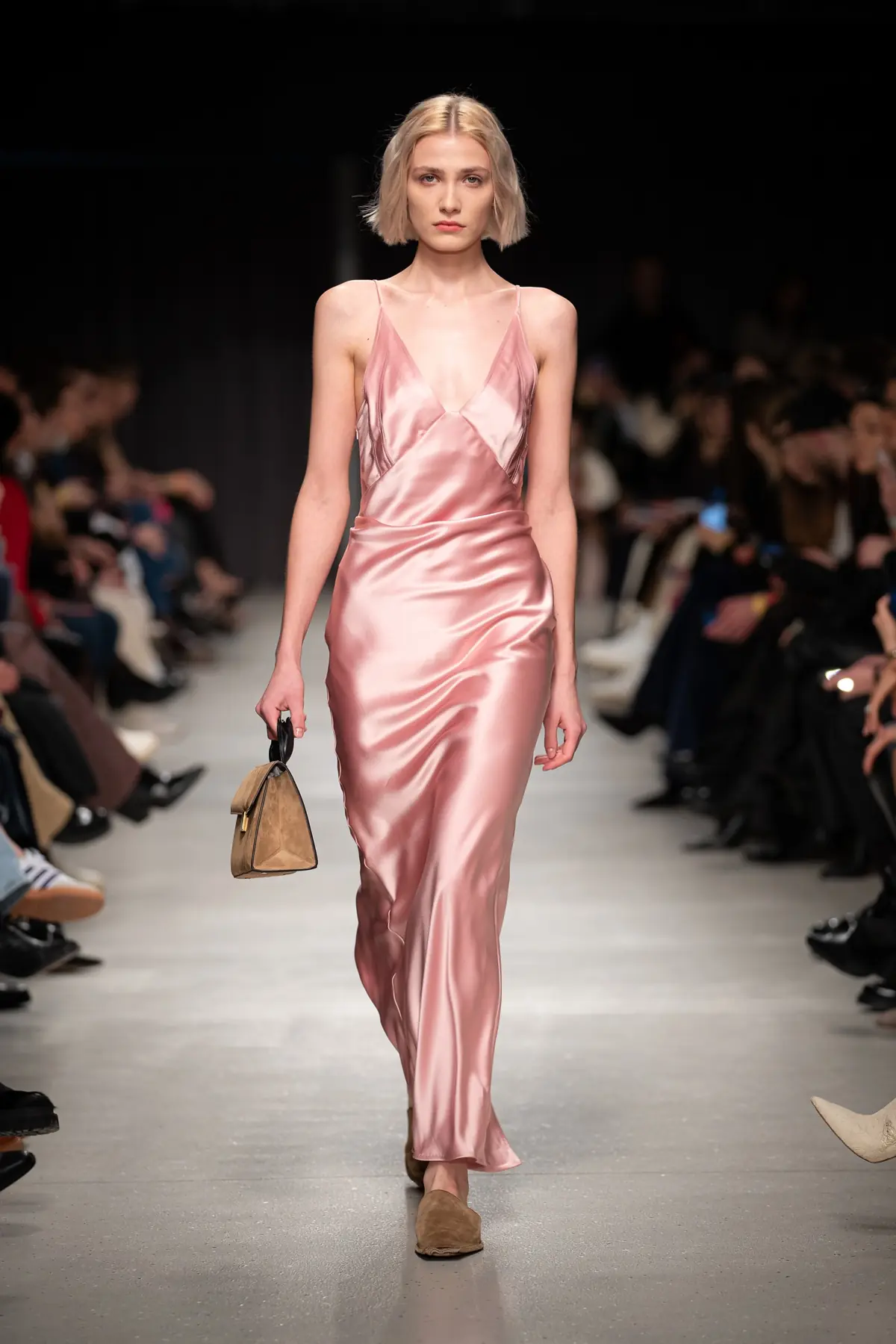 Stop to Smell the Roses je ime nove Pre-Fall 2025 kolekcije najbolj znane madžarske blagovne znamke Nanushka, ki si je svetovno prepoznavnost prislužila z elegantnimi kosi oblačil, kot nalašč za sestavljanje capsule garderobe. Kolekcija, predstavljena v Budimpešti, je sledila prepoznavni estetiki znamke, ustanoviteljica in kreativna direktorica znamke Sandra Sándor pa je navdih našla v spominih na otroštvo, v sprehodih v naravi, na katerih je njen oče zahteval, da je prisotna, povezana z okolico in se zaveda sveta okoli sebe. Ključni kosi kolekcije vključujejo hlače z vgrajenim pasom, srajce ter obleke in krila s tekočimi silhuetami, ki pričarajo nežno lepoto cvetnih listov vrtnic. V kolekciji prevladuje kombinacija materialov, kot so svileni saten, bombaž in Okobor™ tkanina – alternativa usnju, ki je bila razvita znotraj blagovne znamke kot etičen in cruelty-free nadomestek za pravo usnje. Vsak kos je odsev preproste elegance, s katero Sándor prežema vse svoje modne zgodbe in uteleša idejo “mirnosti sredi kaosa”. Eden najlepših kosov Pre-Fall 2025 kolekcije je zagotovo slip obleka v nežno roza barvi, ki izgleda odlično v kombinaciji s svetlo rjavimi detajli.
