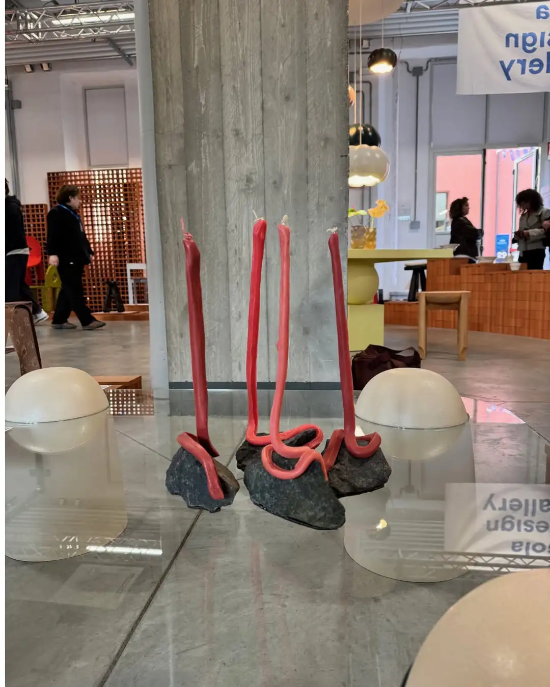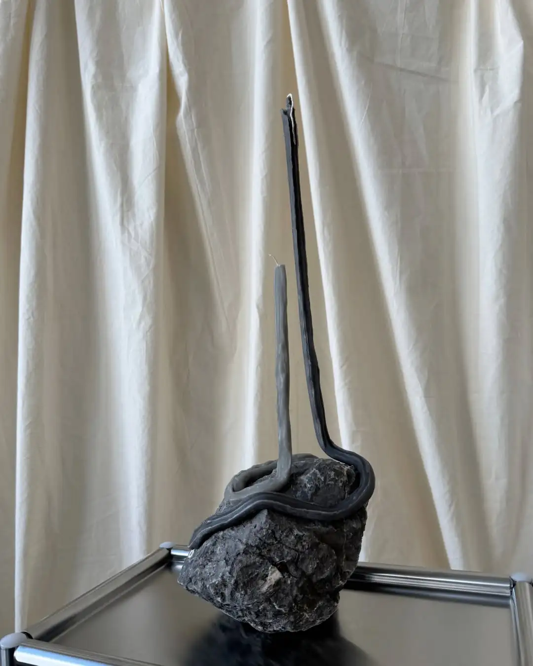Še posebej me je zanimalo delo Ejle Miletić – kiparski ansambel sveč, postavljenih na kamnite podlage. Ko se sveče počasi topijo, puščajo sledi na kamnu in nas tako vabijo, da razmišljamo o staranju kot o tihem procesu preobrazbe. “S spodbujanjem upočasnitve in pozornosti delo poudarja minljivost kot kontrast kulturi hitre potrošnje. Vsaka staljena oblika postane subtilen portret časa in spremembe,” pojasnjuje Ejla, mlada umetnica, ki zadnja štiri leta živi in dela v Amsterdamu. Nekaj korakov raziskovanje naprej in ugotovila sem, da Ejla kot del svoje prakse SADA space, ki se nahaja med oblikovanjem, obrtjo in ritualom, preučuje potek časa. Kako? “Moja dela, ročno oblikovana v čebeljem vosku, so hkrati predmet in proces: sčasoma se spreminjajo, topijo, puščajo sledi in izginjajo. Skulpturalne sveče delujejo kot simbol skupne prisotnosti in bližine.”