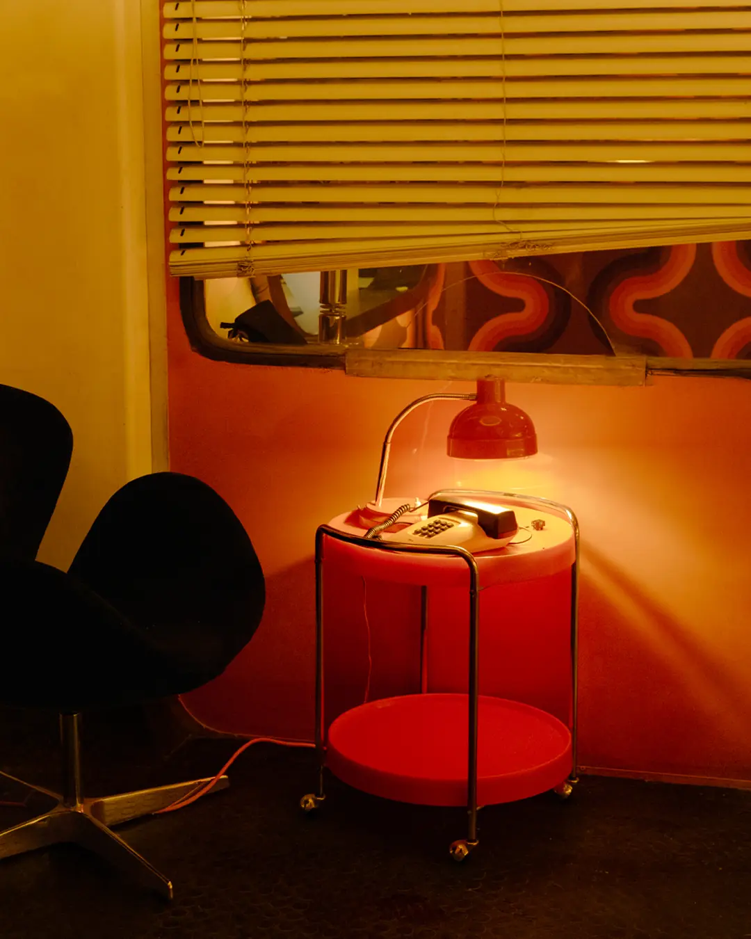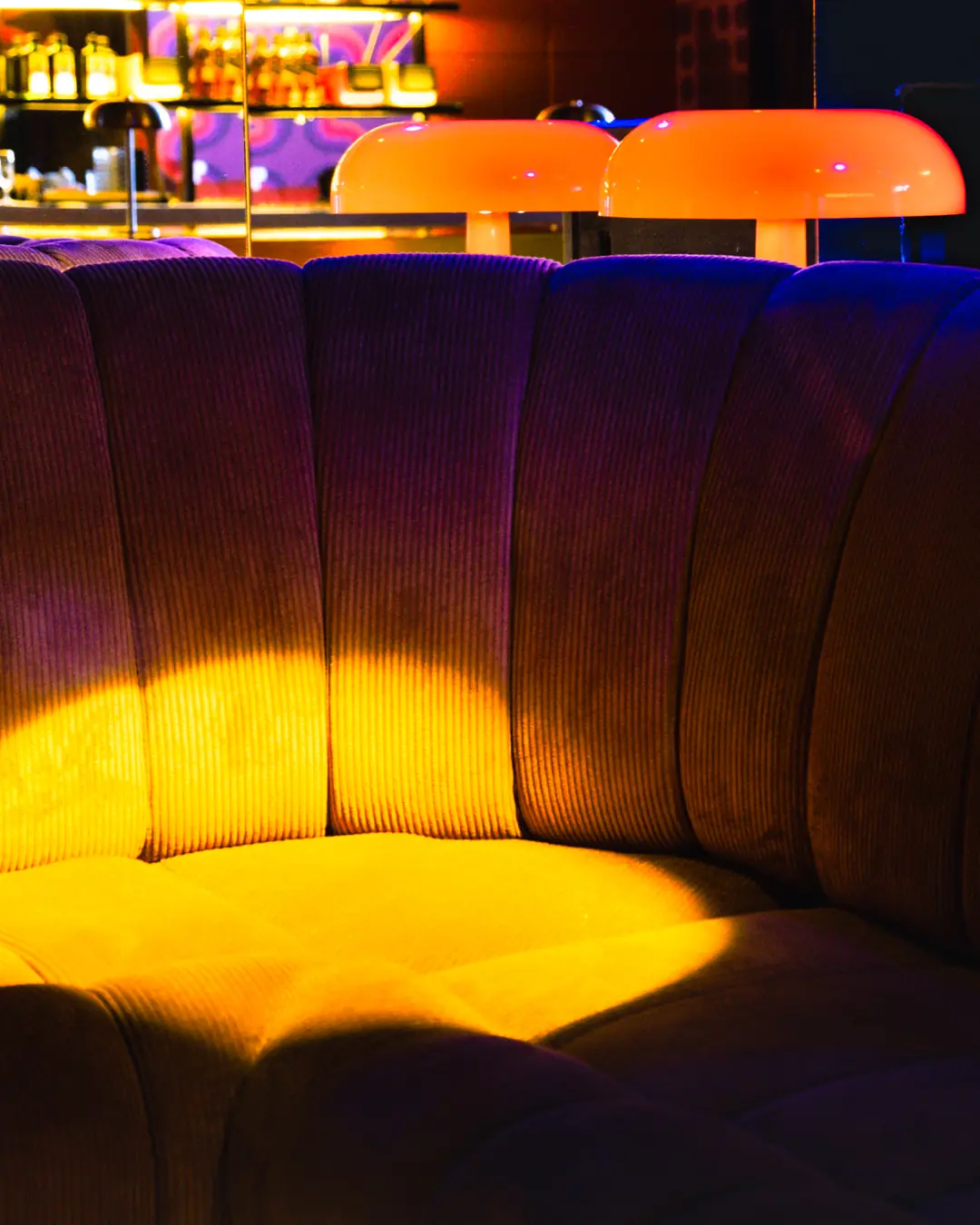 Kao kontrast metalu, ističu se velike površine prekrivene geometrijskim paternima u mat bojama crvene, ljubičaste i narandžaste palete. Forme kao što su kvadrat i krug dominiraju prostorom i jasno međusobno komuniciraju, a ovaj spoj nespojivog nedvosmisleno aludira na scenografiju 70-ih. Naime, do danas nije sačuvano mnogo fotografija jugoslovenskih diskoteka kao što je bila ona Kod Šećera, zato su se Aleksandra i Ana više oslonile na Studio 54. Tu su mogle da analiziraju zidove u pozadini, tapete, i da im to služi kao reper. Svi dezeni na našim zidovima su se tada koristili, objašnjavaju mi, To nisu neke novizmišljene moderne tapete, nego upravo iz tog perioda. Mi smo crtale i dizajnirale te šare, a onda su specijalno štampane u skladu s bojama i geometrijom koje su nam bile potrebne. Isto je učinjeno i sa separeima, samo je materijalizacija bila drugačija – naši su od pliša, dok su u Studiju 54 bili od kože. Ima tu i mnogo skrivenih detalja koja bi mogla lako da vam promaknu u mraku noćnog kluba: mali televizori s antenama, retro telefoni sa žicom, redovi flaša, i sl.
