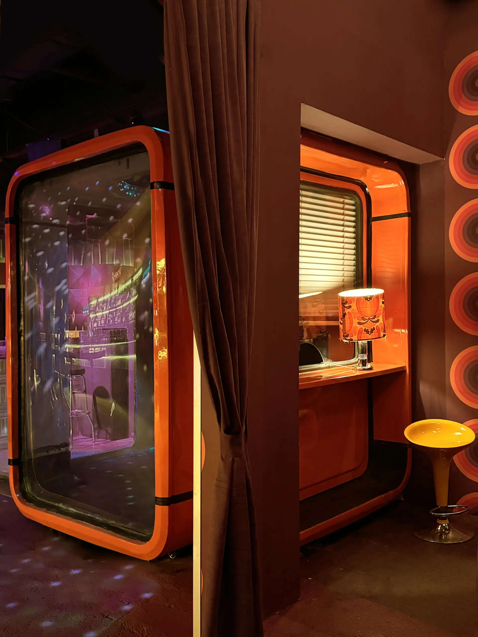 Dosledne ideje o upotrebi starih materijala i komada kao što su korišćeni kopelit za površinu šanka, zatim staklene prizme u hodniku toaleta, DJ pult od metala, pa i sam Kioski K67, u prvi plan ističu i Spiegel Panton lampe na zidovima, a koje klubu daju upravo taj disco vibe 87-tih. Zbog svega toga, arhitektice su tokom čitavog procesa imale osećaj da kreiraju svojevrsnu scenografiju, a ne enterijer. U tom trenutku, Spiegel Panton lampe su bile revolucionarne, a mi smo ih radili custom-made. Crtale smo ih, zatim gledale kako će ih izmodelovati i napraviti kalup, sve korak po korak. One nisu kupljene. U periodu 60-tih i 70-tih godina prošlog veka došlo je do ekspanzije upotrebe plastike kao inovativnog materijala, koji je bio pristupačan i jeftin na tržištu, u različitim granama industrije, tako i u dizajnu. Zato nismo želele da zaobiđemo ni plastiku u enterijeru, pa ni sam proces proizvodnje.