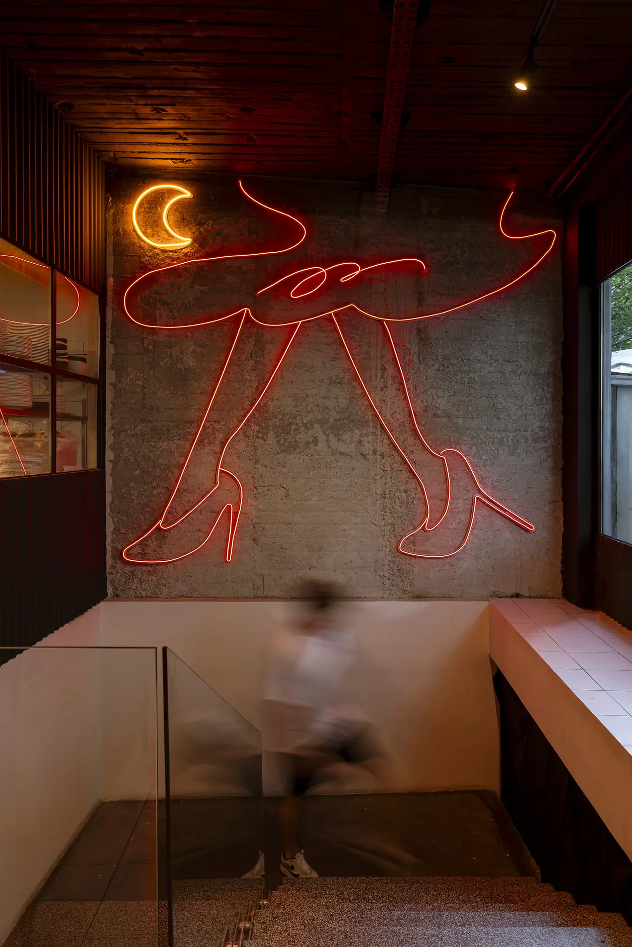 Konceptualno osmišljen kao odgovor na arhitektonske i enterijerske trendove, a koji podrazumevaju oživljavanje retro dizajna i upotrebu vintage enterijerskih komada perioda 70-tih i 80-tih, Budućnost je savremni klub koji nas iznova upoznaje sa stilom i poletom zlatne disco ere, muzike i funkyja. Odmah na početku razgovora, napominju mi da je gotovo sve što su uneli u lokal bilo vintage – u šarenim snovima jugoslovenskog dizajna, sa svemirskim, fluidnim i neonskim elemantima: Retro komade još od osnivanja našeg studija 2018. godine implementiramo u projekte. Volimo da ih pronalazimo, restauriramo i stavljamo u neki novi kontekst. Sve što smo uneli u Budućnost je, neću reći autentično, ali staro i vintage. Ima mnogo kolekcionara, naročito u Vojvodini, gde se mogu pronaći najrazličitije dragocenosti iz tog perioda. Gotovo da ništa novo nismo kupili: ukoliko nešto i nismo pronašli u arhivama, to smo pravili: lampe na primer.