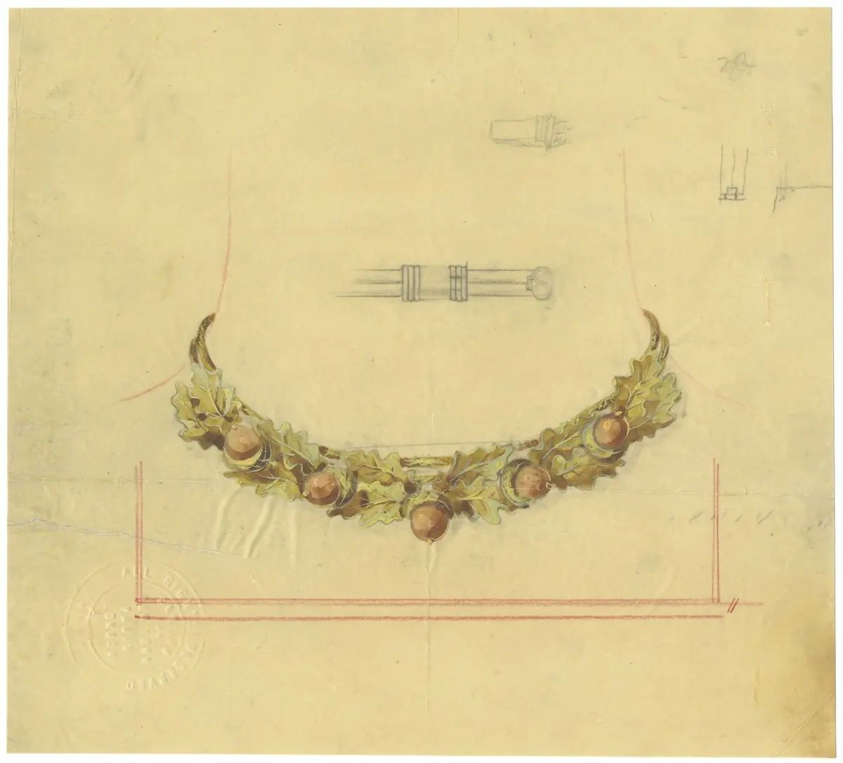 Dizajn za jesensku cvjetnu ogrlicu. Posebna narudžba Cartier New York, 1950. Izrađena u crvenom i žutom zlatu.
