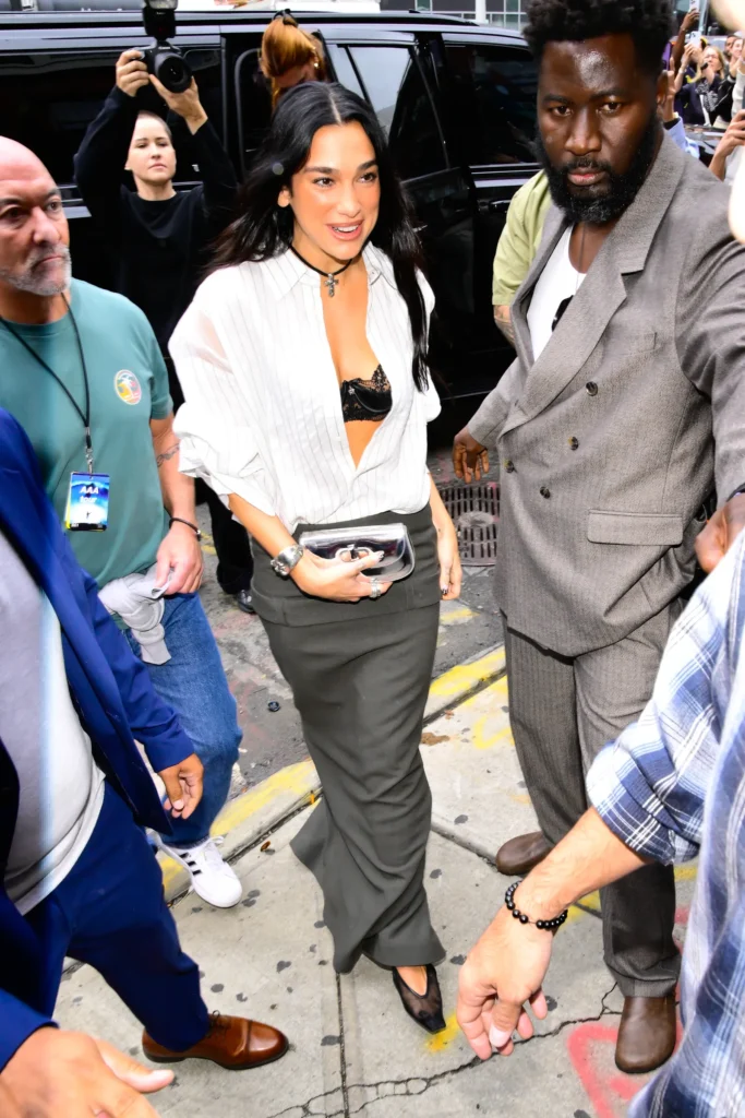 Ranije ovog leta, choker je nosila i Elle Fanning, takođe uparivši ovu smelu ogrlicu sa u potpunosti crnim outfitom, a trendu se pridružila i Dua Lipa. Njen outfit najviše me je podsetio na način na koji smo chokere nosili u prošlosti, uz predimenzioniranu košuru ispod koje proviruje čipkasti grudnjak. Međutim, ova kombinacija bila je neosporivo savremena, sa maxi suknjom i providnim cipelama.