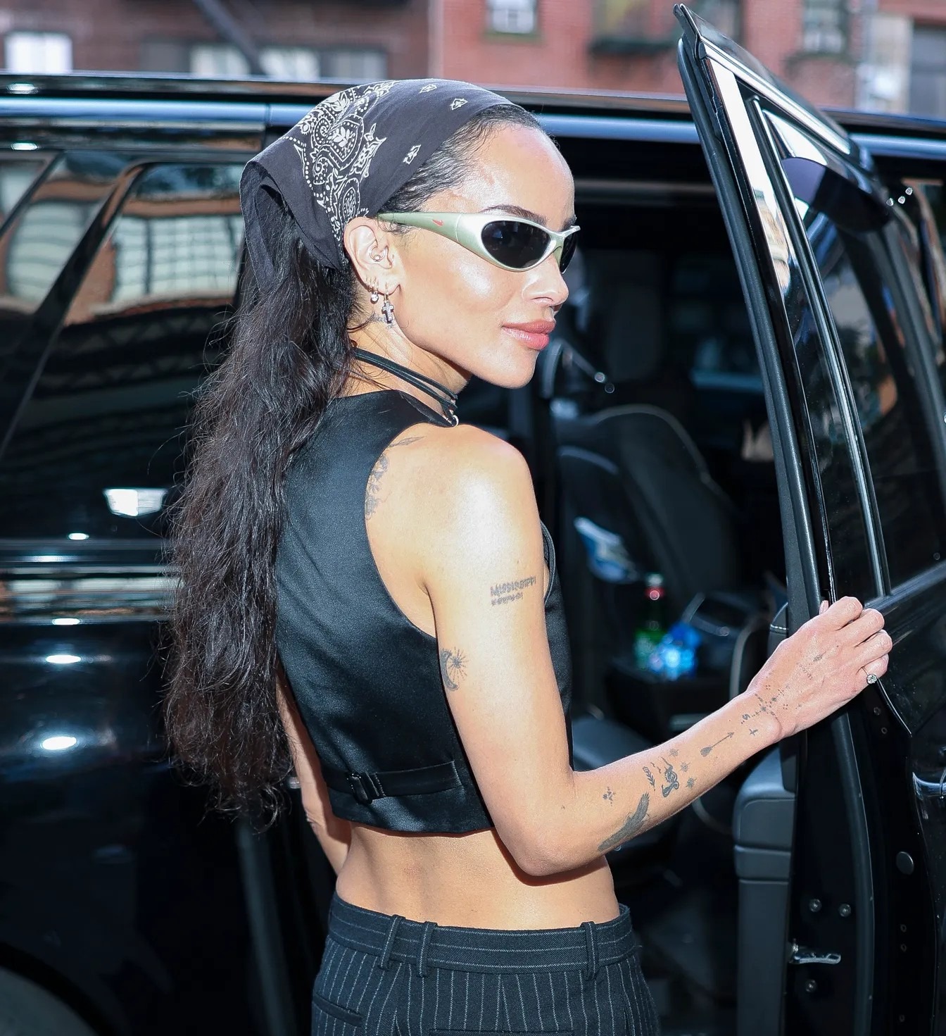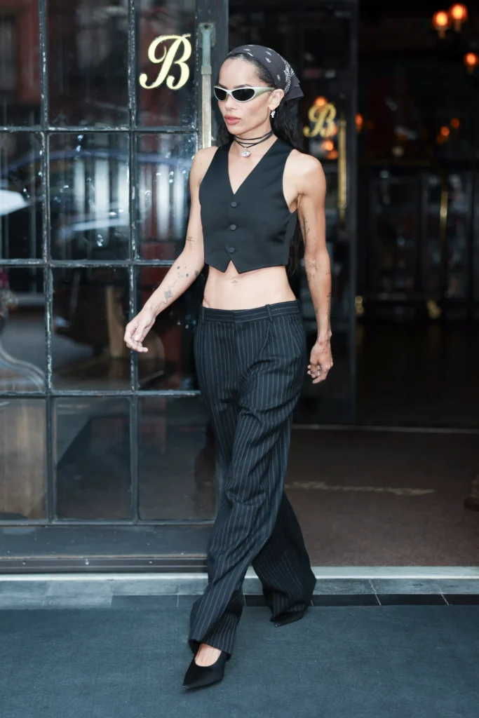 To je dokazala Zoë Kravitz, kada je nedavno nosila u potpunosti crni outfit – prugaste pantalone niskog struka, prsluk i cipele sa potpeticom – koji je kompletirala sa sjajnom kombinacijom aksesoara. Nosila je bandanu, jedan od ovogodišnjih omiljenih dodataka, srebrne naočare za sunce, nekoliko naušnica i choker ogrlicu. Reč je o crnoj ogrlici sa priveskom koji je glumica obavila nekoliko puta oko vrata i postigla efekat chokera.