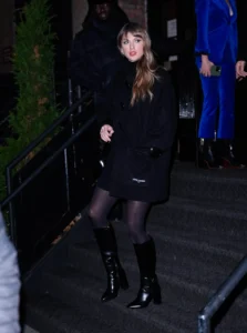 Koža, prevrnuta koža ili životinjski print – nije tajna da Taylor Swift obožava čizme do kolena. Njen omiljeni izbor u poslednje vreme je lakirani model sa blok potpeticom, savršen da podigne njene razne kombinacije za večernje izlaske. Često ih stilizuje sa mini-suknjom, oslanjajući se na njihove korene iz mod ere šezdesetih, ali bi jednako dobro izgledale i uz duge, lepršave porube ili čak pantalone širokih nogavica.