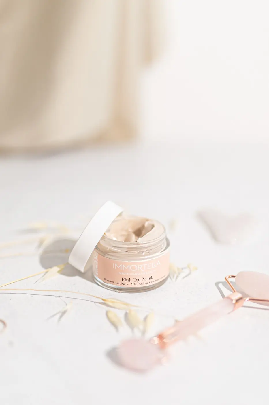 Immortella Pink Oat maska je spas u poslednjem trenutku. Spaja izuzetno negujuću moć ovasa i popularne roze gline, a obogaćena je prebioticima i hijaluronskom kiselinom. Jedinjenje samog kompleksa je jednostavno, ali kada se kombinuje na koži efekat je izvanredan. Savršeno umiruje crvenilo, ali kako koža izgleda posle maske mora da se doživi. Kao da ste posle 15 minuta ove roze kremaste maske dobili novu i lepšu kožu. Pink Oat maska odlično hidrira kožu, pruža veoma blagu eksfolijaciju sa AHA kiselinom koja se razvije u dodiru sa kožom, a istovremeno jača kožnu barijeru sa probioticima.