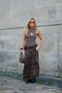 S modnih pista selimo se u street style, gde trendovi dobijaju svoju konačnu potvrdu. Dugačke boho suknje jasno su prihvaćene, a posebno se istakla njihova kombinacija s čizmama od brušene kože. Ovaj spoj vraća nas pravo u 70-e, a ujedno je jako svestran: pleteni ili prsluk sa resama stvaraju retro utisak, dok s dodatkom sakoa izgleda vrlo elegantno.