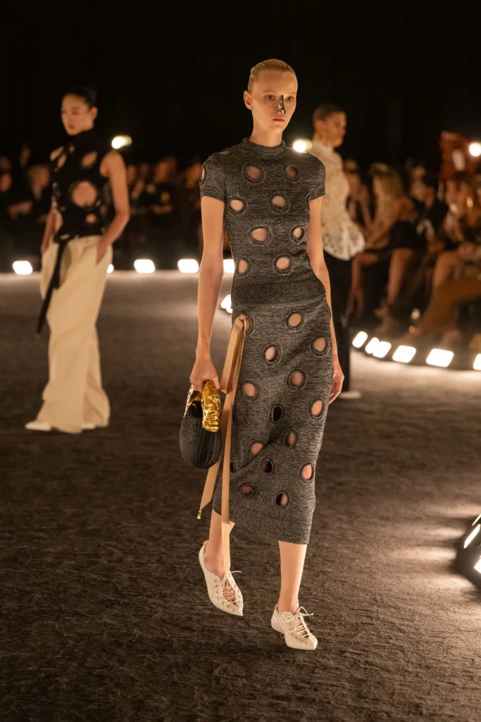 Demnin debi za Gucci bio je glavna tema – baš kao što bi mogao da bude i kostim za Halloween koji ga interpretira. Look iz kolekcije za proleće 2026. koji čini bunda sa animal printom od veštačkog krzna, crnim salonkama i Gucci torbom na ruci, jedan je od najikoničnijih. I zapravo biste imali puno pravo da kažete da ste na Halloween proslavi lik iz House of Gucci, ako ne i Patrizia lično.