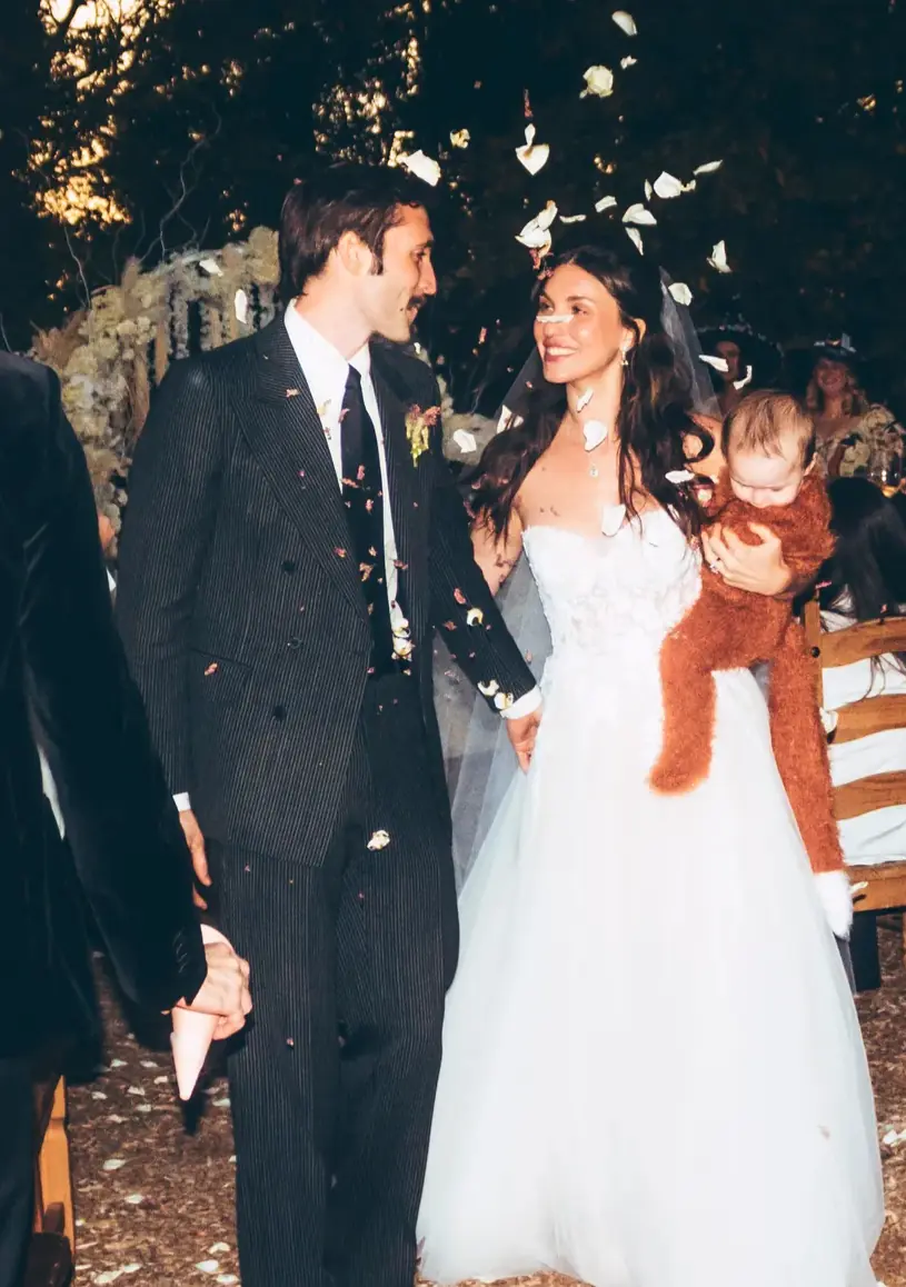 Rainey je bila podjednako precizna i kada je reč o stajlinzima za svadbeni vikend. Znala je da želi da nosi nešto vintage ili second-hand i počela je da isprobava haljine otprilike četiri nedelje nakon porođaja. „Mnogo mi je stalo do zaštite životne sredine,“ objašnjava Rainey. „Želela sam haljinu koja je lagana, udobna i u kojoj mogu da plešem. Mnoge žene presvuku haljinu posle ceremonije, ali ja sam svoju želela da nosim celu noć, jer to možeš samo jednom!“ Savršenu haljinu pronašla je u butiku Loved Twice Bridal u Beverli Hillsu – model dizajnerke Mire Zwillinger. „Haljina je bila s modne piste, pa je nijedna mlada još nije nosila, ali se i dalje smatrala second-hand. Za mene je bila idealna.“