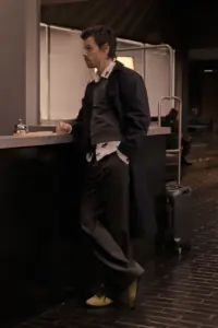 Isto bi se moglo reći i za Stylesovu suptilnu, ali značajnu stilsku promenu tokom godina povlačenja, kada je počeo da uživa u civilnijoj, odnosno “normalnijoj” garderobi. Na primer, 2024. godine fotografisan je u Rimu s Alessandrom Micheleom, čovekom zaslužnim za sve njegove mašne, perjane boe i raskošno zvonaste odijela kasnih 2010-ih, dok je nosio prugastu majicu, Levisice i Adidas Sambasice. Ili, još nedavnije, 2025., kada je prošetao severozapadnim Londonom u dugom sivom vunenom kaputu i pantalonama kuće Olsen. (Zapravo, nije li to gotovo isti outfit koji nosi i u videu za Aperture?)