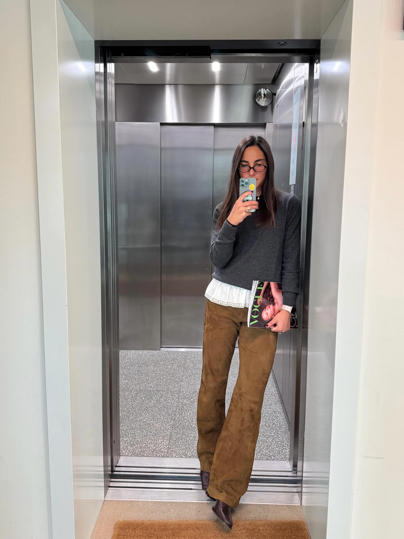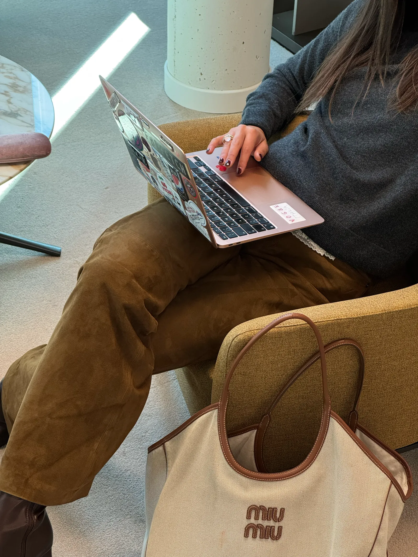 Obožavam da kombinujem odevne komade i modne dodatke s kontrastnim vajbom: karamel pantalone od prevrnute kože i svilenu majicu s čipkastim detaljem, sve to uz slojevitost. Neizostavan komad je klasični sivi pulover, a na nogama moje omiljene čokoladno smeđe gležnjače. Torba? Isključivo oversize, tačnije Miu Miu platneni tote bag, velik i totalno chic!