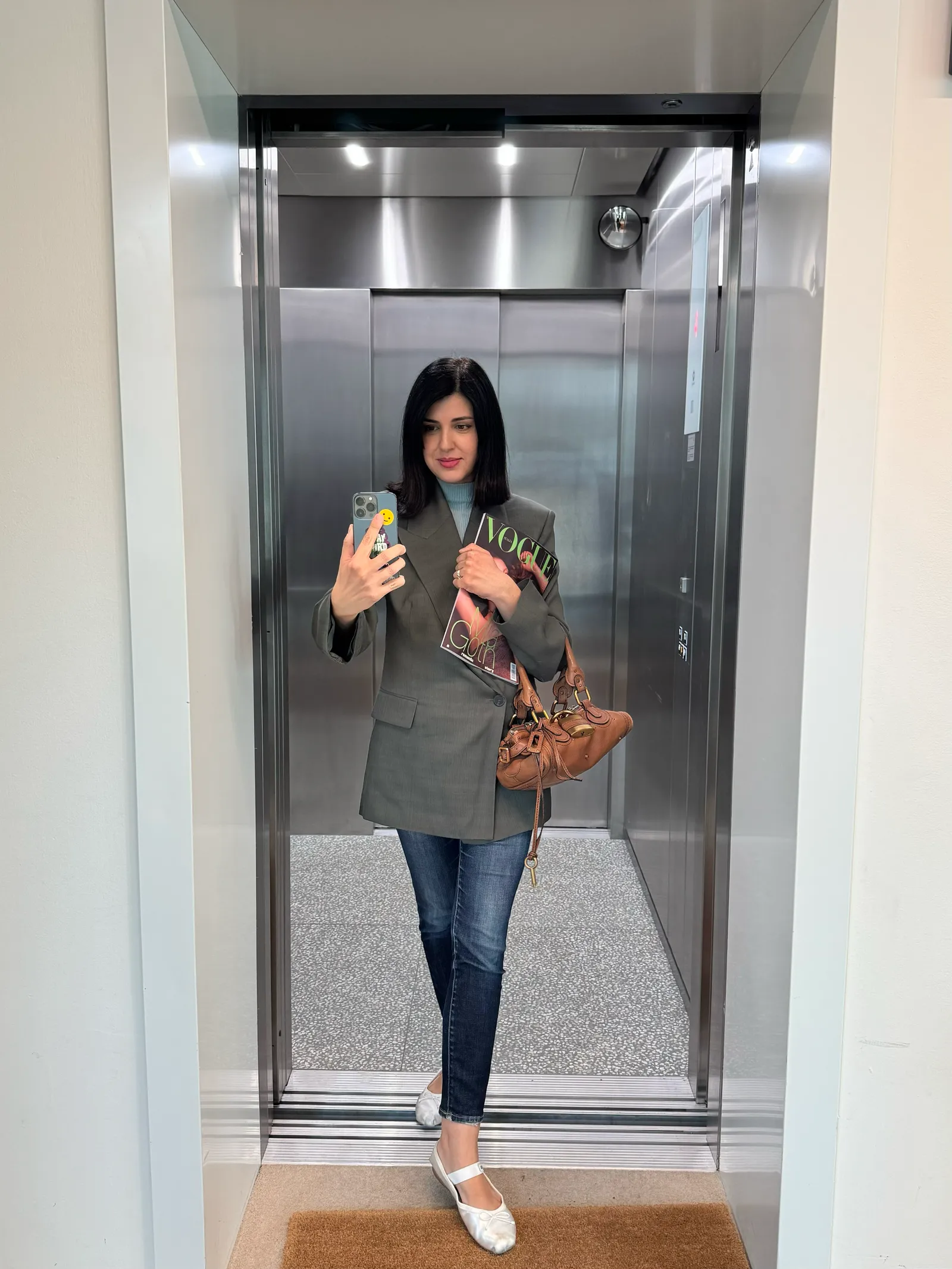 Za moj jesenji kancelarijski look, kao polazište biram udobnost, ali bez odustajanja od formalnosti zahvaljujući oversized blazeru, čija naglašena ramena celom outfitu daju strukturu. Volim kontrast s jednostavnijim farmerkama, koje čine da look ne deluje ukočeno. U poslednje vreme privlače me hladne boje: siva nijansa blazera i svetloplava boja mog Sa Su Phi kašmir pulovera savršeno mi odgovaraju sezoni. Dodala sam i dva svoja klasika: mini Paddington torbicu Chloé iz 2006., kupljenu u eri kada je Phoebe Philo vodila kreativni smer brenda (pažljivo čuvam tu torbicu kao malo blago) te Miu Miu baletanke u ballet verziji, sjajne i super udobne.