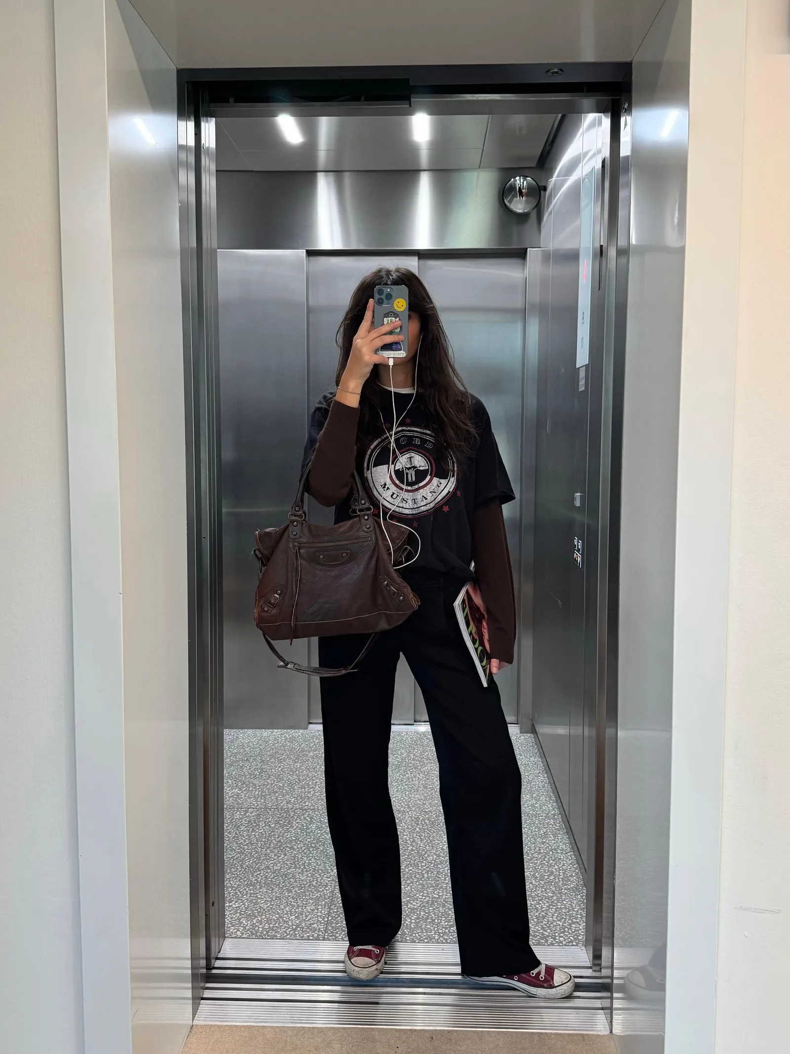 Kada znam da ću dan provesti pišući (i skačući s jednog sastanka na drugi), ključna reč je udobnost. S vremenom sam shvatila da je presudno osećati se dobro u onome što nosim. Tip sam za pantalone, s posebnim afinitetom prema boyish lookovima, a jesen je savršena za igru slojeva. A kako je layering svuda oko nas, ja ga interpretiram na svoj način: pulover nosim ispod oversized majice, tako da meke rukave u boji tamne čokolade ostavljam vidljivima.