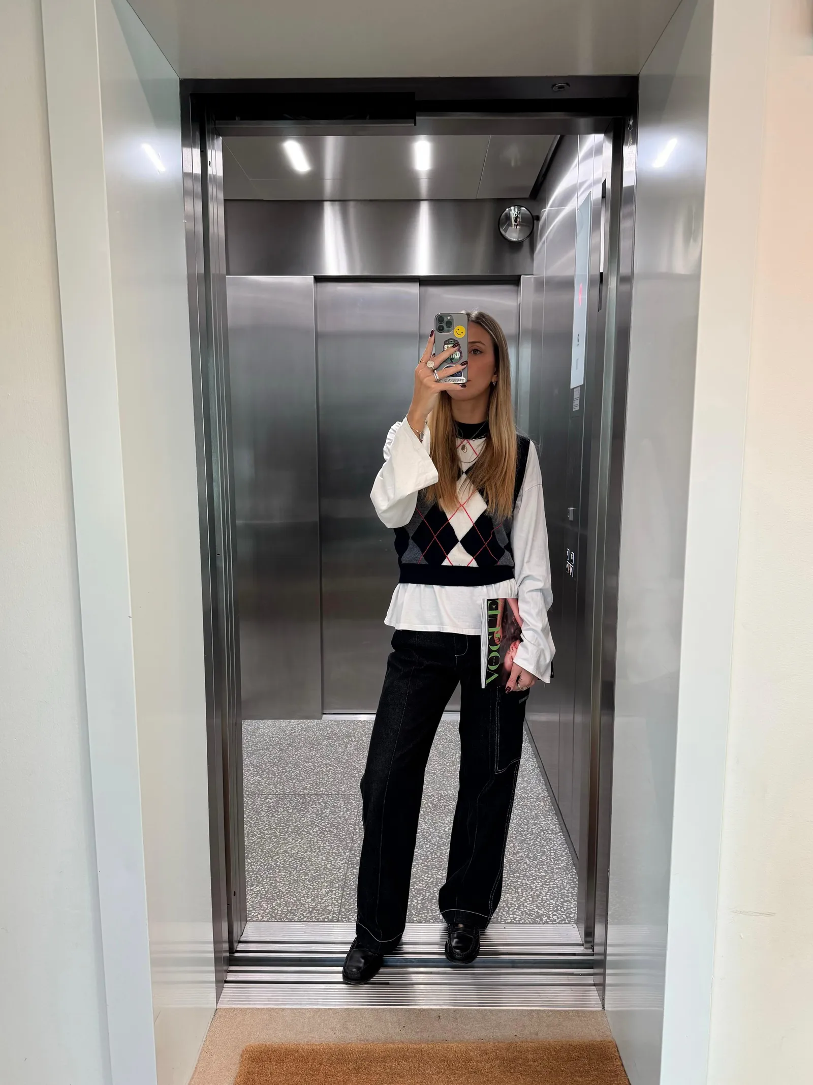 Prsluk na kvadrate dodaje taj moj omiljeni nerdy chic detalj zbog kojeg se svaki put nasmešim, a mokasine sa belim čarapama zaokružuju celu priču laganim, uz bezbrižni touch. Spremna sam da pretvorim i najtmurniji dan u malu igru sa stilom.