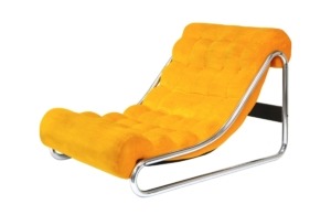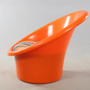 Ikea bucket chair, dostupna u tada modernim bojama (beloj, smeđoj i narančastoj) s prošivenim jastukom. Početna cena: 5,50 evra. Jedan od najprepoznatljivijih primera pristupačne estetike Space Age perioda.