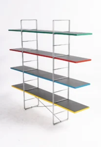 Bočni zidovi od žice i police s obojenim rubovima, polica je zamišljena kao rodica sastava Moment. Dokumentovana cena: 65 evra. Lagani, vizualno zanimljiv komad koji savršeno utelovljuje urbanu estetiku osamdesetih.