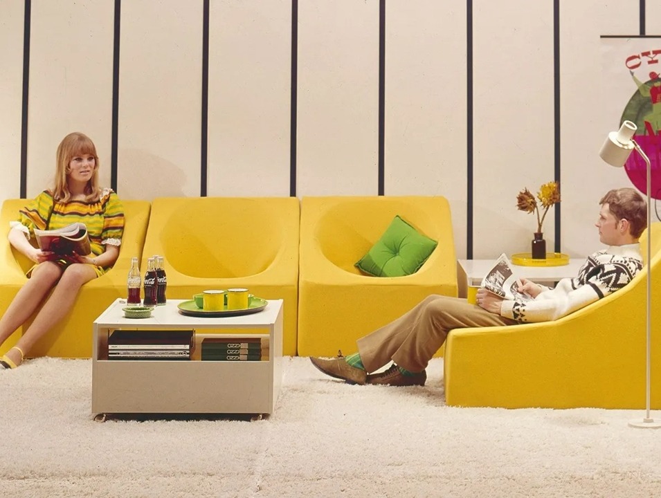 Ikea bucket chair, dostupna u tada modernim bojama (beloj, smeđoj i narančastoj) s prošivenim jastukom. Početna cena: 5,50 evra. Jedan od najprepoznatljivijih primera pristupačne estetike Space Age perioda.