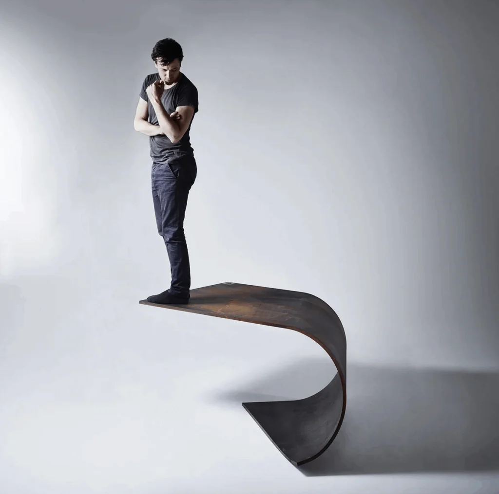 Britanski dizajner koji živi i radi u istočnom Londonu, poznat je po svom neortodoksnom pristupu materijalima u radovima koji obuhvataju javnu umetnost, skulpturu i arhitektonske instalacije. Ovaj brutalistički stočić mi se jako sviđa, Sličan je dvodelnom dizajnu kao kod mog stočića Bivalvia. I ovim komadom Cocksedge istražuje granice između funkcionalnog objekta i skulpturalnog dela, spajajući praktičnost i umetnički izraz. Izvrstan stočić! Dobar je primer i njegov prethodni rad Poised.