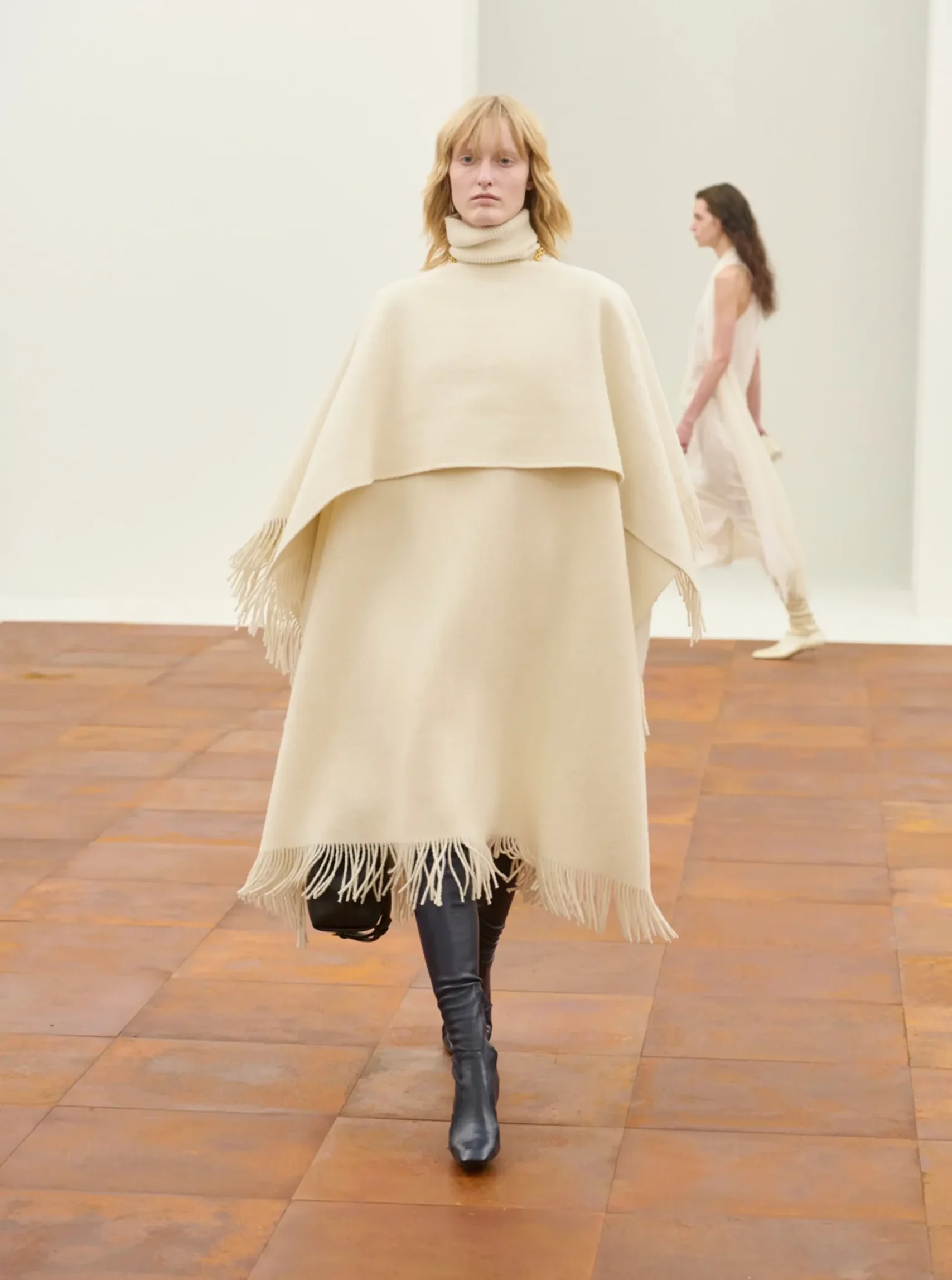Sa sve većom popularnošću pelerina i njima sličnih jakni u uličnom stilu, Kendallin izbor deluje kao savršen i moderan twist trenda. A iako neobičnog oblika, ovaj kaput bio je prikazan u brojnim dizajnerskim kolekcijama za jesen/zimu 2025. Na reviji njujorškog brenda Altazurra videli smo nekoliko verzija ovog kaputa, kraće i duže modele sa pelerinom koja celom looku daje dodatnu dimenziju, u Toteme kolekciji predstavljeni su brojni neobični, a izrazito cozy kaputi, među kojima se onaj sa pelerinom posebno istakao, a u Calvin Klein kolekciji videli smo modele standardnih kaputa preko kojih je prebačena pelerina.