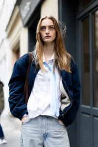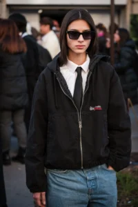 Na vrhu naše inspo liste nalazi se Loli Bahia, kojoj je kravata sastavni deo garderobe. Ona bira crni model koji nosi u kontrastu sa belom košuljom i oversized Stüssy jaknom sa kapuljačom. Što se donjeg dela tiče, farmerke su neizostavne. Da li je kombinacija oversized jakne, košulje i kravate na putu da svrgne s trona vanvremenski belu majicu i blejzer? Manekenke su presudile i odgovor je – da!