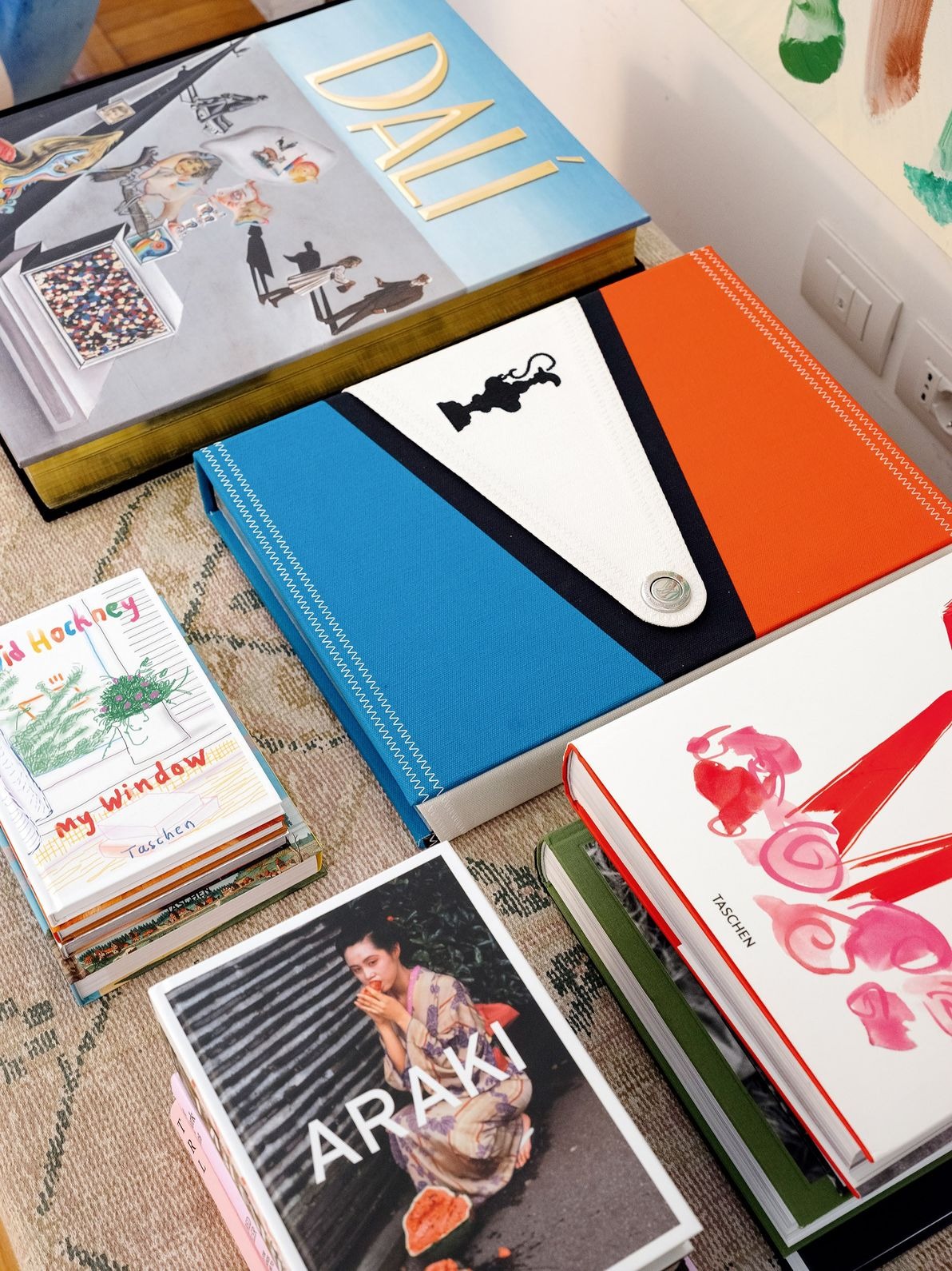 Kao što je i bilo za očekivati, stan je prepun Taschenovih izdanja, poređanih na policama koje se protežu od poda do plafona. Prostor odiše istovremeno sofisticiranom i opuštenom atmosferom. U dnevnom boravku, prozračnom prostoru sa belim zidovima, počasno mesto zauzima monumentalna knjiga Davida Hockneyja, primer oversized izdanja iz kolekcije Sumo, čiji je početak bio svezak posvećen Helmutu Newtonu, toliko veliki da je za njegovo uvezivanje bio angažovan isti majstor koji povezuje vatikansku „Bibliju“(ujedno je postao i najskuplja knjiga objavljena u 20. veku, kad je primera potpisan od strane 80 poznatih osoba s fotografija, a prodan je na aukciji za 430.000 dolara).