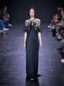 Zašto ga je odabrala: „Ono što me kod Matica Velera uvek fascinira jestw njegova sposobnost da tehnološku preciznost – od laserskog rezanja do kompleksnih teksturalnih tehnika – pretvori u nešto eterično, gotovo živo. Ovaj look to savršeno otelotvoruje: forma deluje mistično i krhko, a istovremeno snažno, kao da se pred nama odvija trenutak transformacije. Gornji deo siluete podseća me na gusenicu u trenutku prelaska u leptira, stvarajući organsku strukturu koja pulsira pokretom čak i dok je telo potpuno mirno. Taj efekat donosi tihu, unutrašnju dramatičnost izvedenu s izuzetnom elegancijom. Upravo taj balans između modne konstrukcije i nosive poezije čini Velerov rad toliko posebnim i prepoznatljivim.“