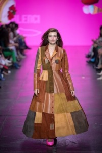 Zašto ga je odabrala: „Ono što kod Sarivalenci uvek volim jeste njena razigrana konceptualnost i hrabrost da preterivanje učini estetikom, a neuobičajene materijale pričom. Ovaj kožni look to savršeno pokazuje. Patchwork kaput deluje poput krinoline koja u sebi nosi pokret. To je komad koji vas doslovno podstiče na igru – da se zavrtite oko svoje osi i osetite kako se silueta otvara i zatvara oko tela. Konstrukcija u različitim nijansama smeđe deluje poput modne mape: slojevita, taktilna i vizuelno bogata. Silueta savršeno odražava Sarinu autentičnu lakoću, kao da poručuje da ništa nije “previše” kad je vizija jasna. To je njen potpis – kreacije koje vas uvuku u jedan drugi svet, gde moda nije samo odeća, već mali performans, vizualni kolaž koji želite da proučavate izbliza.“