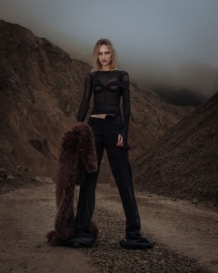 Opis komada: Look sastavljen od prozirnog topa, pantalona izrazito dugih nogavica i krznenog detalja iz kolekcije jesen/zima 2025.