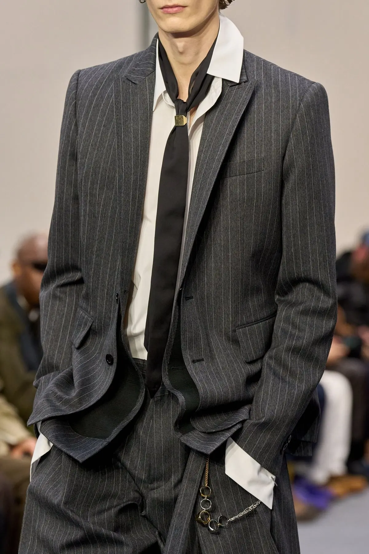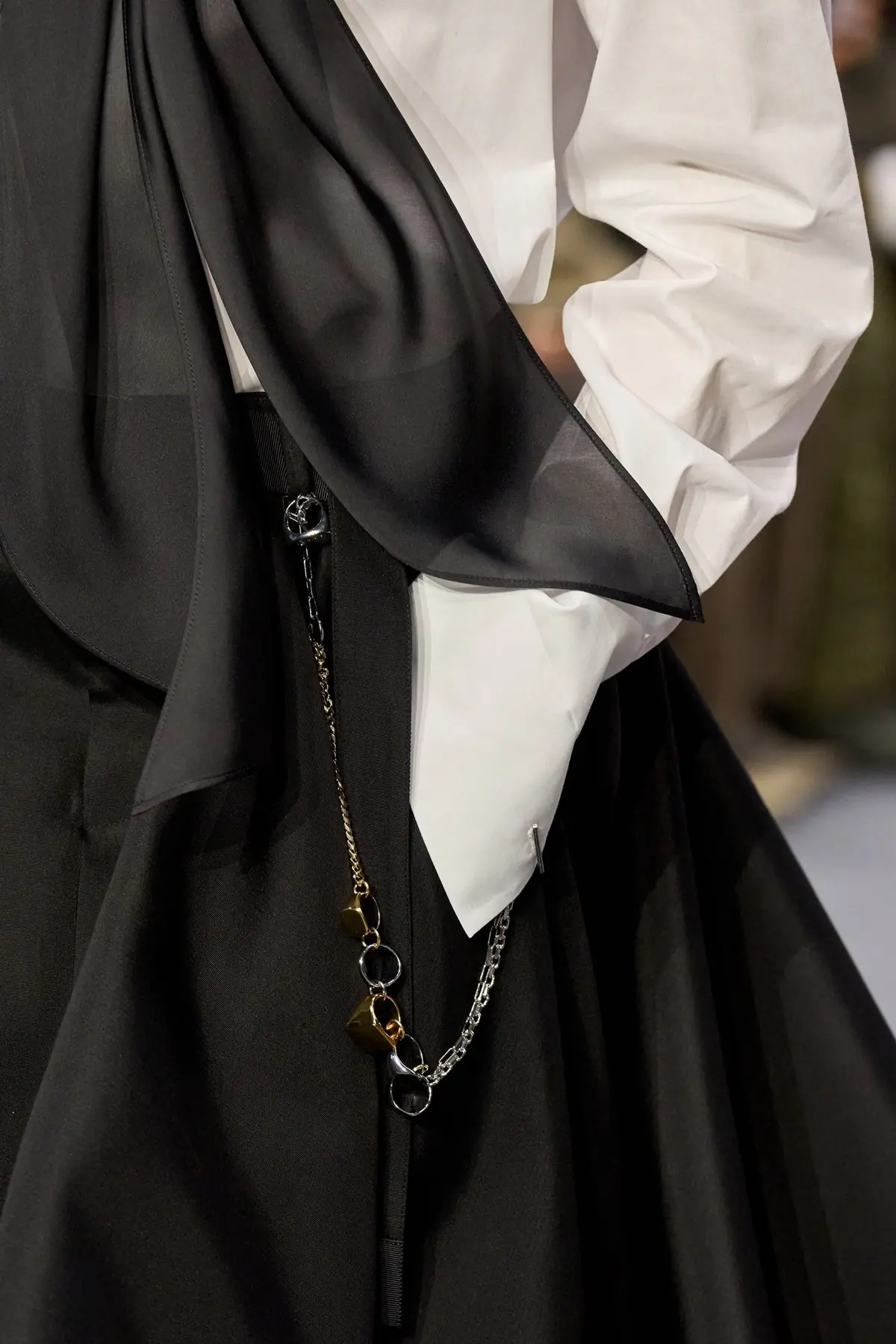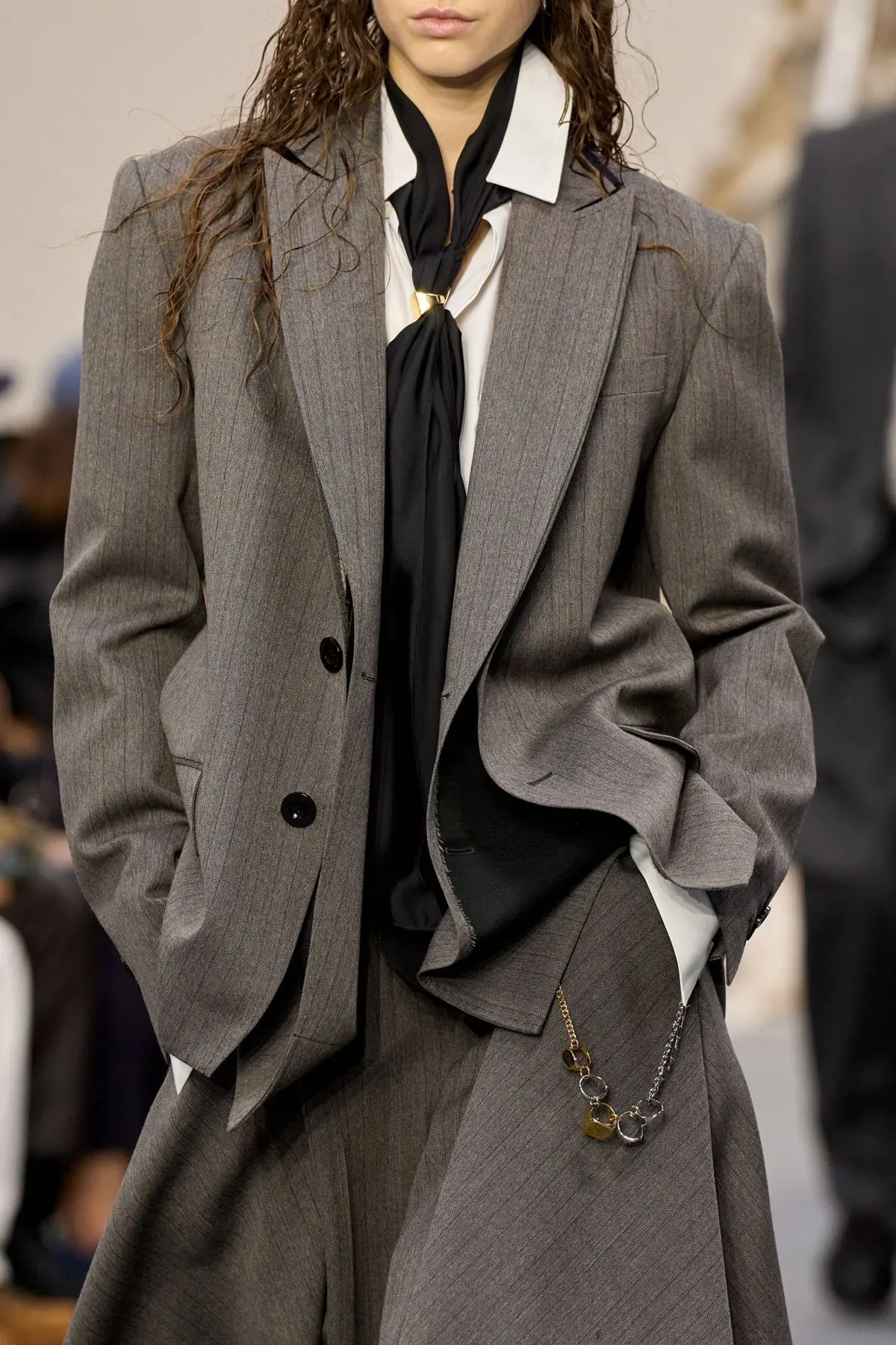 U Sacai viziji za jesen 2026 prstenovi su dobili posve novu namenu. Zlatni i srebrni pečatnjaci poređani na tanki lanac krasili su lookove okačeni o farmerke i suknje čineći zanimljiv detalj koji automatski podiže utisak čitave kombinacije. Zašto ne biste… svoj prsten nosili na drugačiji način? Tako je Diana, zaista nema razloga.
