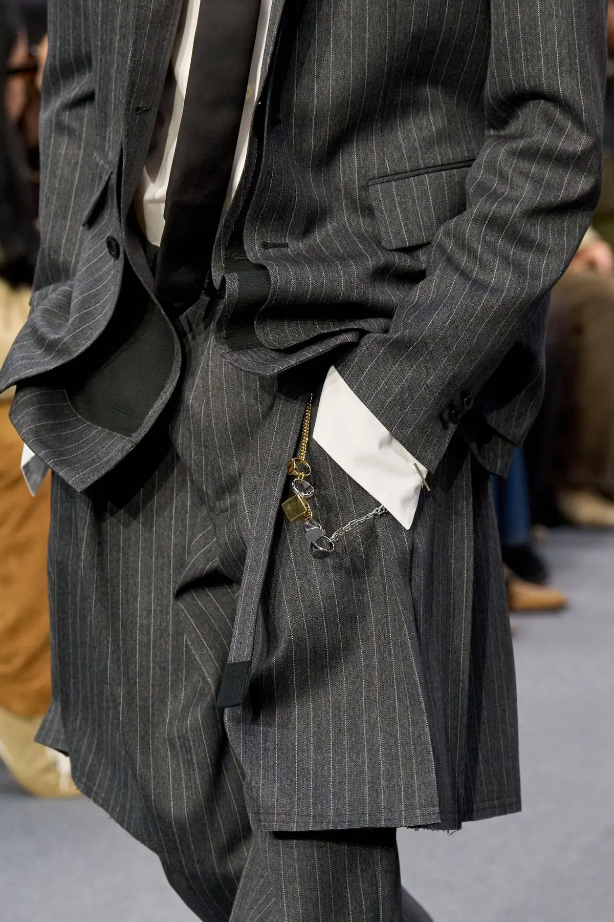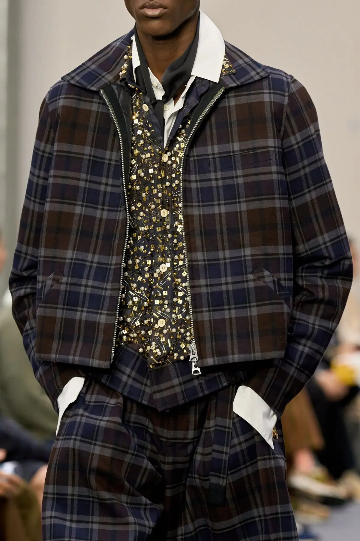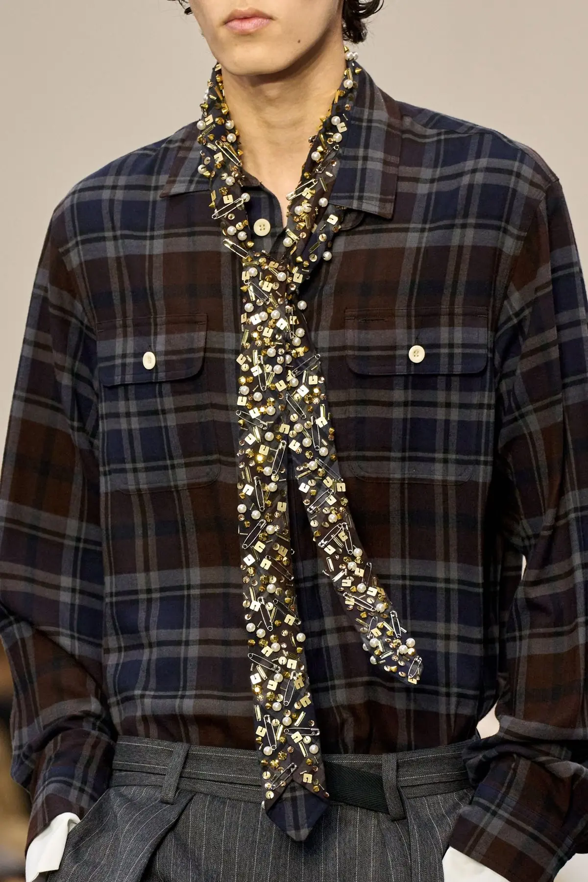 Neko je jednom rekao da je „đavo u detaljima“, a s obzirom na to da sam ovog ponedeljka evidentno raspoložena za parafraziranje tuđih izjava, reći ću da se, osim đavola, u detaljima krije i dobar dizajn. Chitose Abe tu je tezu potvrdila svojom najnovijom kolekcijom za Sacai, u kojoj je u savršeno procenjenoj dozi spojila nosiv dizajn s elementima koji ga čine novim, svežim i uzbudljivim. Krojevi koji spajaju kratke i duge pantalone u jedan odevni predmet, odvažni spojevi i slojevi, bela i tartan košulja kao klasična baza i nonšalantno vezane kravate koje su vijorile u hodu samo su neki od elemenata kojima je Sacai izbrisao granice između muškog i ženskog odevanja. Lookovi su delovali univerzalno i slobodno u toj univerzalnosti, no ono što je posebno privlačilo pažnju bili su detalji koji su u svakom kreativcu probudili ono večno pitanje: Kako se ja toga pre nisam setio? Prstenovi, kao centralni motiv, prenamenjeni su u ukrase za kravate ili decentne (ali efektne) dodatke na rukavima košulja, dok su dugmići i zihernadle „razbacani“ u stotinama, prekrivajući košulje i kravate.