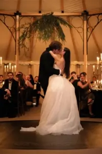Subota, dan ceremonije, doneo je najklasičniji bridal izbor s potpisom Vere Wang. Haljina je imala lagano spušten struk, a preko italijanskog tila korpasto tkana organza eterično se kretala pri svakom koraku. Uz nju je mlada nosila čipkasti veo Vera Wang, bele satenske rukavice Cornelia James, traku u nijansi slonovače zavezanu pomereno van centra i til okovratnik. Od nakita je odabrala dijamantne minđuše smaragdnog reza i dve teniske narukvice – dijamantnu i akvamarin, „drago kamenje mog rođenja, jednu sam dobila od mame, a drugu od Erica“. Look je zaokružen belim satenskim Jimmy Choo cipelama s personaliziranom pločicom s datumom. Mladoženja je nosio odelo The Armoury New York.