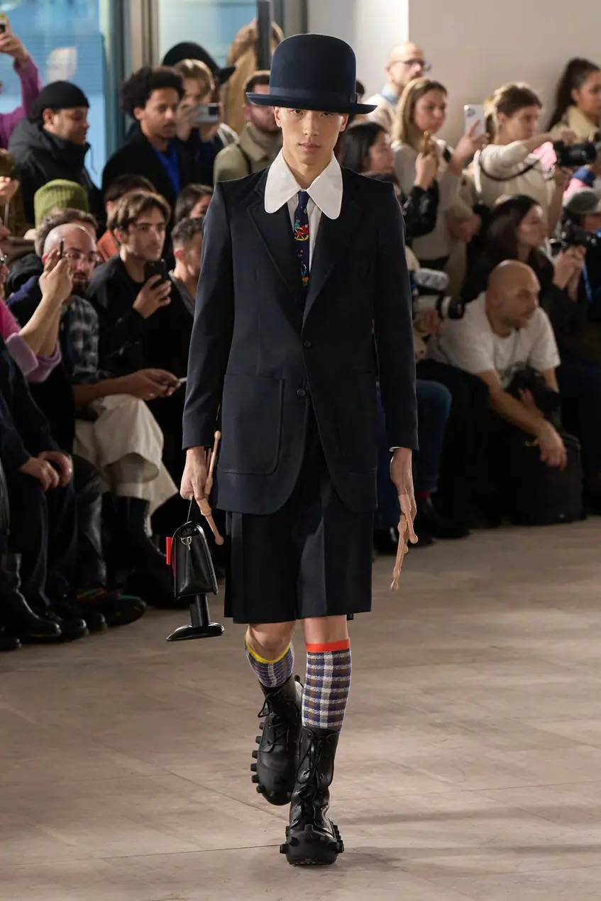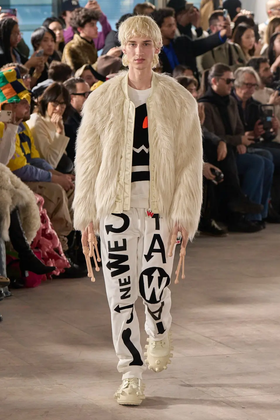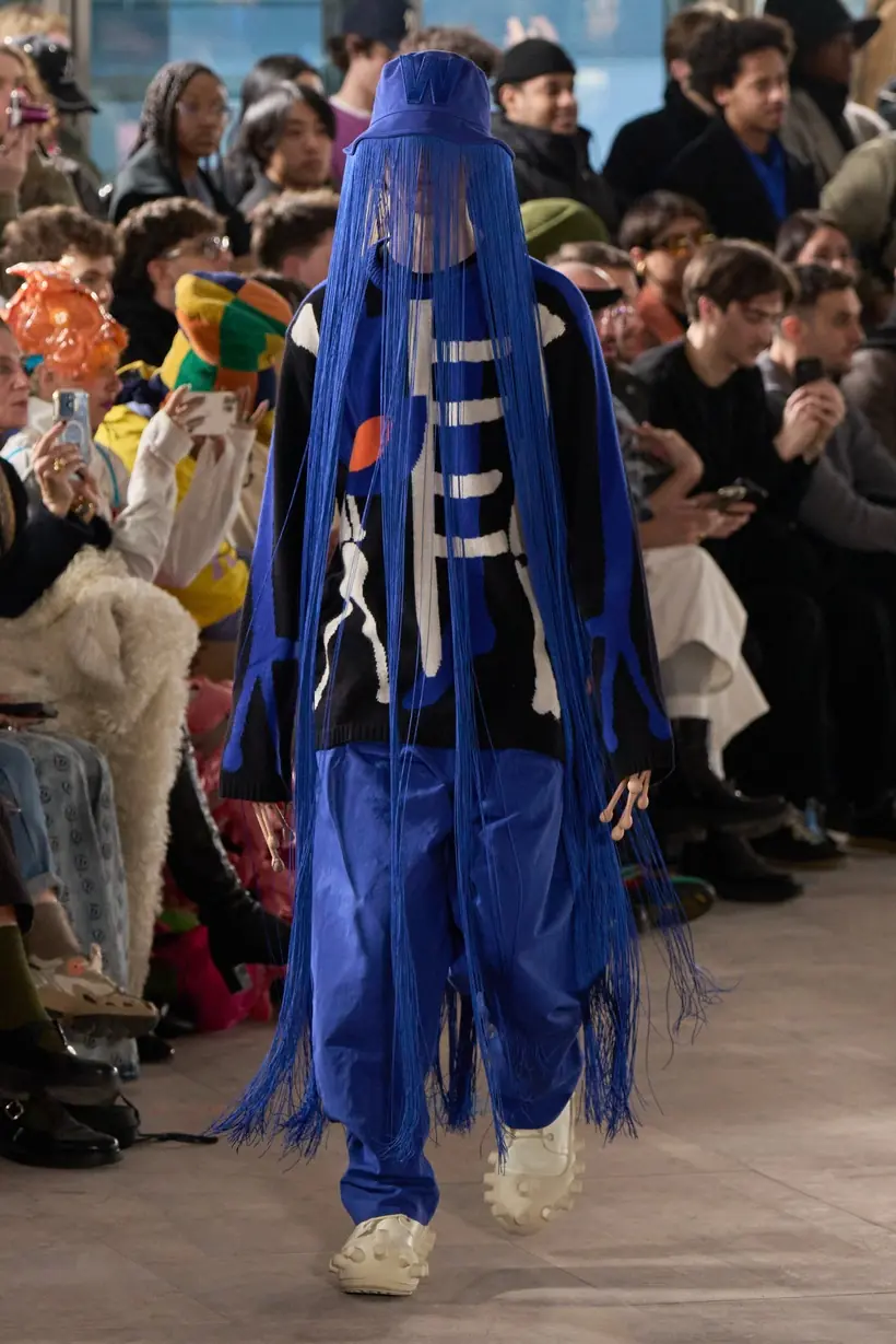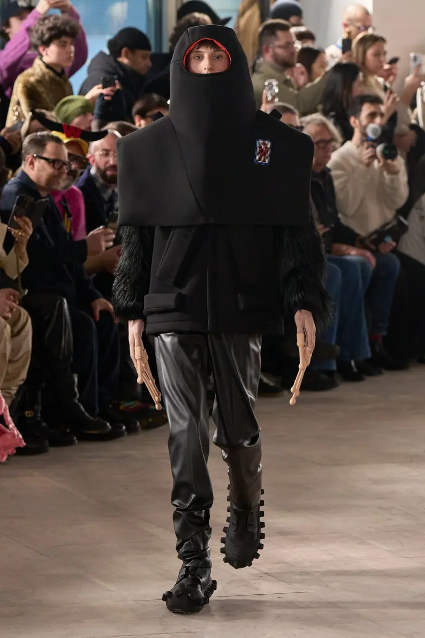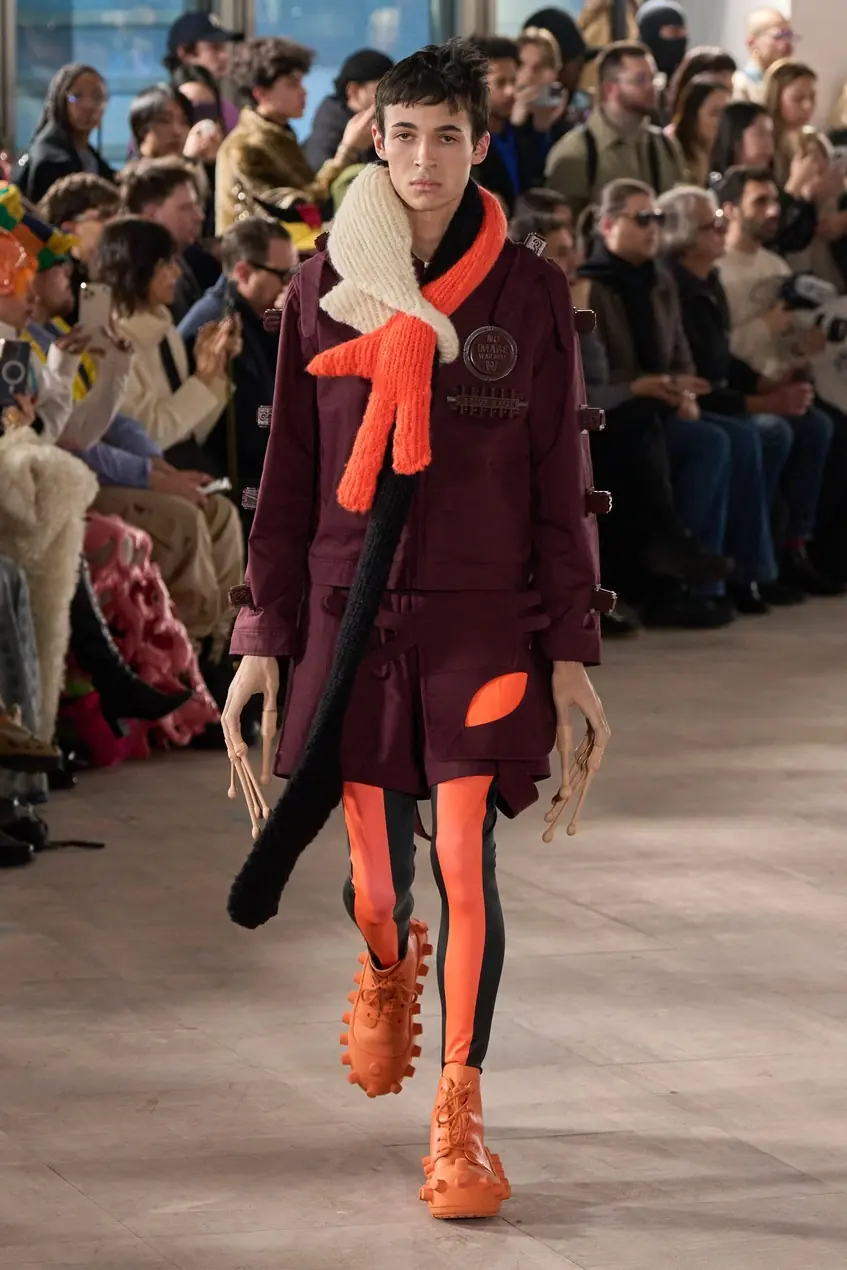 U centru pažnje ipak su se našli inovativni modni dodaci. Tu su bucket šeširi sa dugim resicama, koje podsećaju na velove u distopijskim kostimima, čarape u jarkim bojama i interesantnim dezenima, šal u obliku kokošje noge (da, zaista) i patike koje već dodajemo na listu najneobičnijih cipela. Njihovi đonovi okruženi su izbočinama zbog kojih podsećaju na stopala nekog stvorenja iz drugog univerzuma. Ruke modela takođe su transformisane sa silikonskim nastavcima na prstima, koji asociraju na E.T.