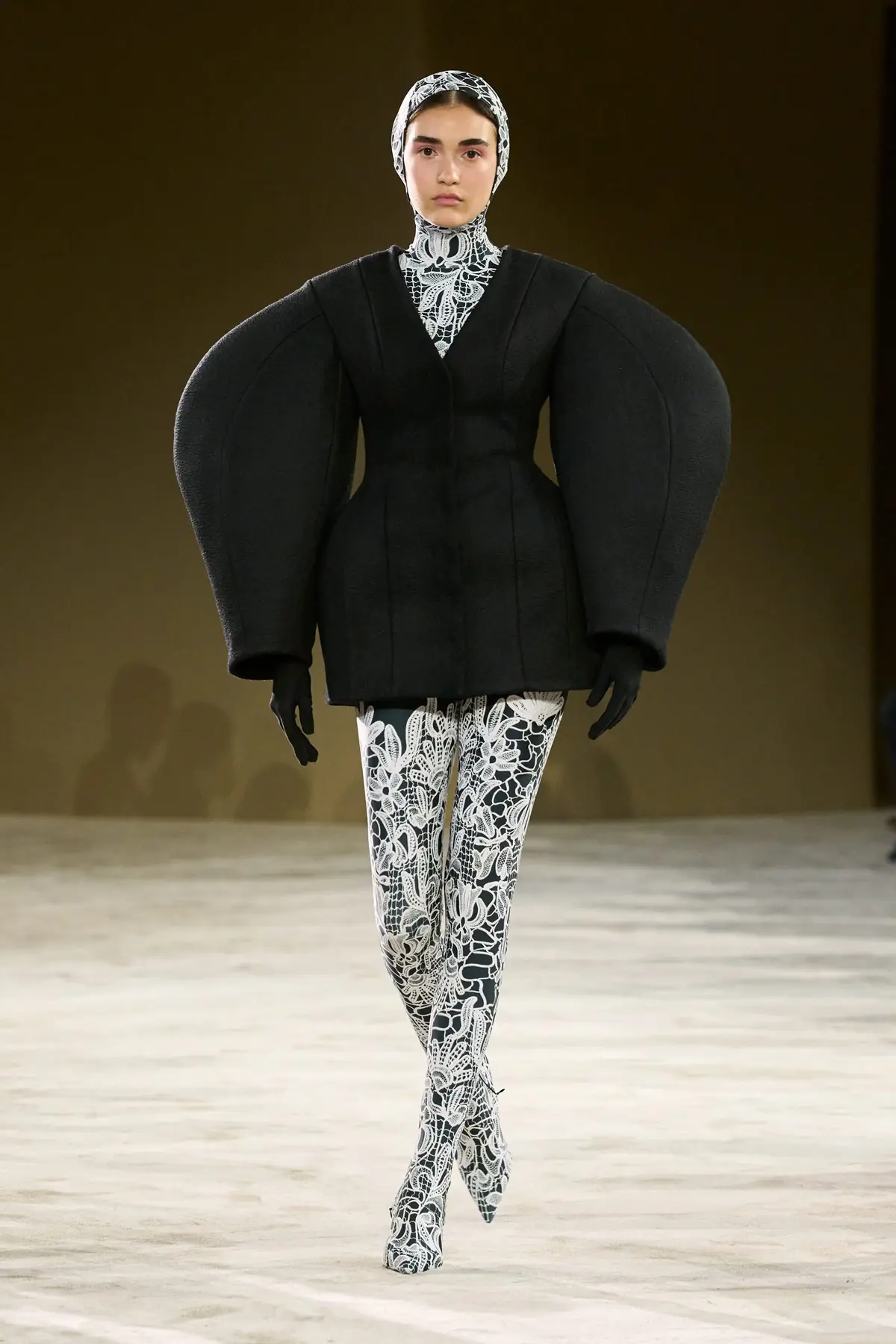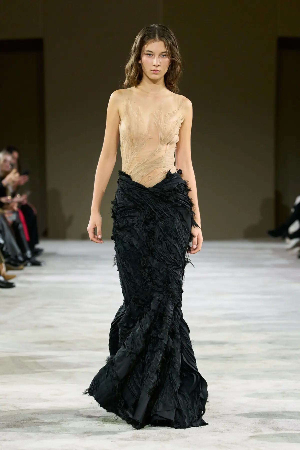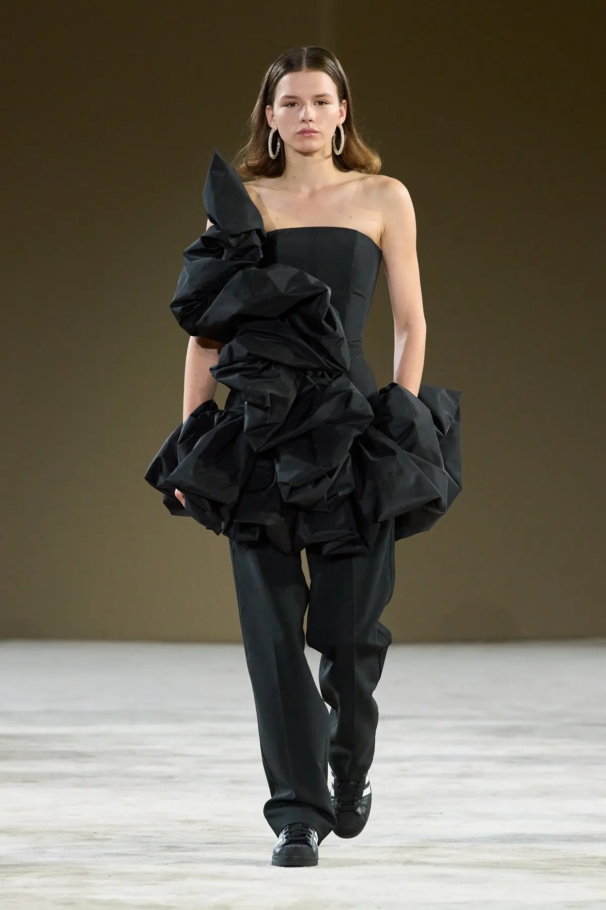 Gudu, the brand of designer Lashe Mdinaradze, founded in Kyiv, is an intriguing exploration of black – its shapes, textures, meanings, and messages. On one hand, there is a complex and meticulous construction; on the other, a theatrical manipulation of forms – both clearly rooted in the designer’s background as a graduate costume designer for opera and theater. In fashion, these elements intertwine brilliantly and skillfully, giving each piece a contemporary expression aimed at the modern, sophisticated, and boldly confident woman. Dramatically sculpted taffeta on one side, sharply constructed fabrics and leather on the other – even when styled with adidas Superstar sneakers – felt progressive and powerful, evoking the iconic Japanese design school.