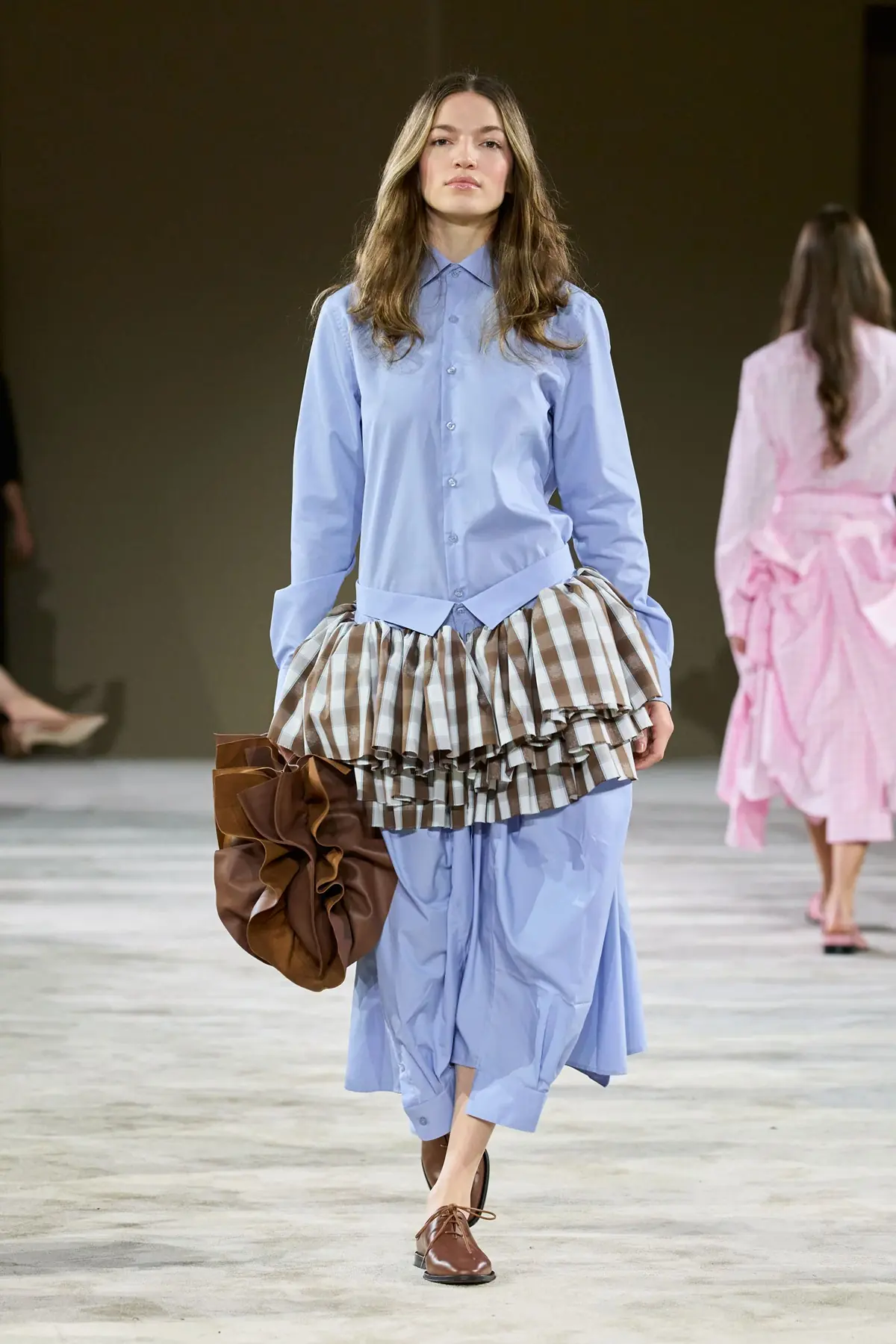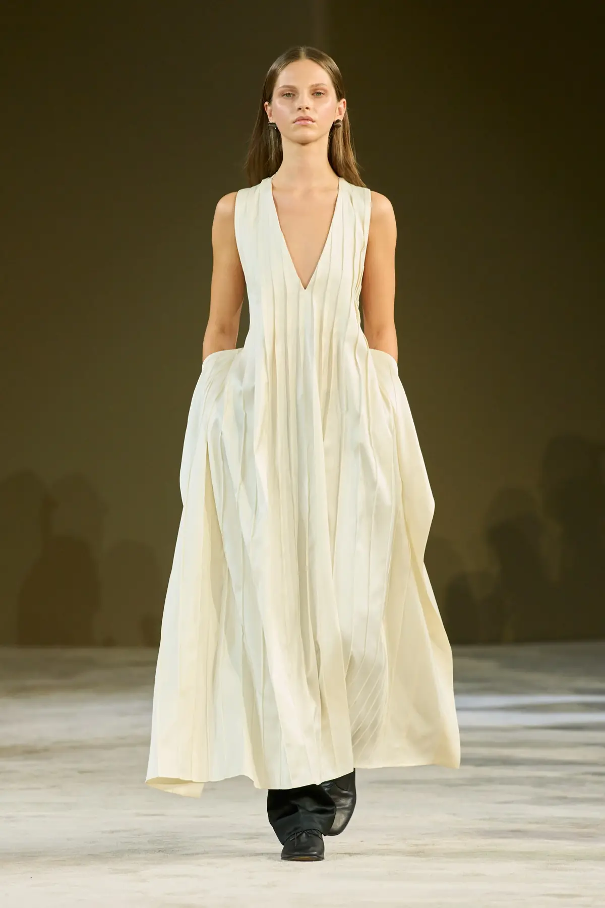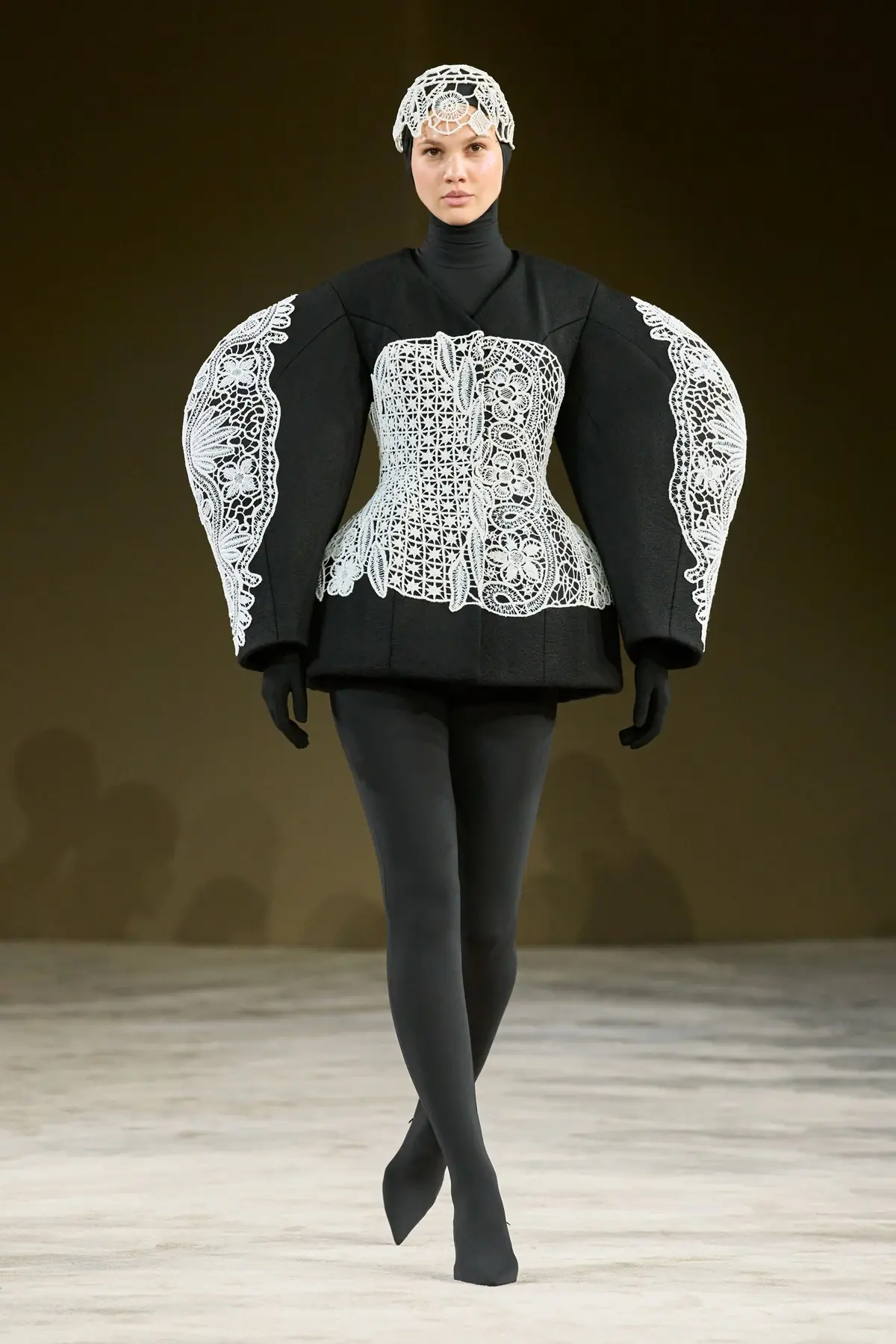 Gudu, the brand of designer Lashe Mdinaradze, founded in Kyiv, is an intriguing exploration of black – its shapes, textures, meanings, and messages. On one hand, there is a complex and meticulous construction; on the other, a theatrical manipulation of forms – both clearly rooted in the designer’s background as a graduate costume designer for opera and theater. In fashion, these elements intertwine brilliantly and skillfully, giving each piece a contemporary expression aimed at the modern, sophisticated, and boldly confident woman. Dramatically sculpted taffeta on one side, sharply constructed fabrics and leather on the other – even when styled with adidas Superstar sneakers – felt progressive and powerful, evoking the iconic Japanese design school.