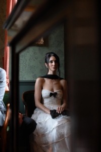 On Friday, at the Welcome Party, Eva opted for a Chanel-inspired look: a vintage satin wedding dress with a lace bodice and a ballerina-style tulle skirt, accented with a black bow at the heart-shaped neckline, paired with a black vintage Chanel clutch, Chanel earrings, a black chiffon scarf, and simple black patent Jimmy Choo shoes. “The dress immediately felt balletic, and I collaborated with the seamstress to adapt it perfectly to my vision.”